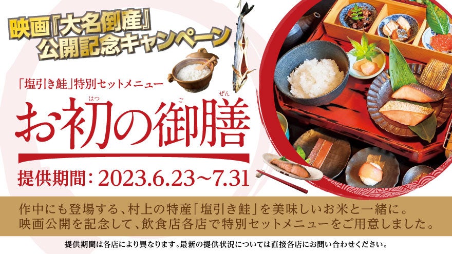 この映画公開を記念して、村上市では映画『大名倒産』×新潟県村上市コラボ企画を実施中です。映画を観賞して、小四郎たちが愛した越後・丹生山藩≒村上藩の風情が今なお残る新潟県村上市を訪ね、名物の鮭料理もご賞味ください!!