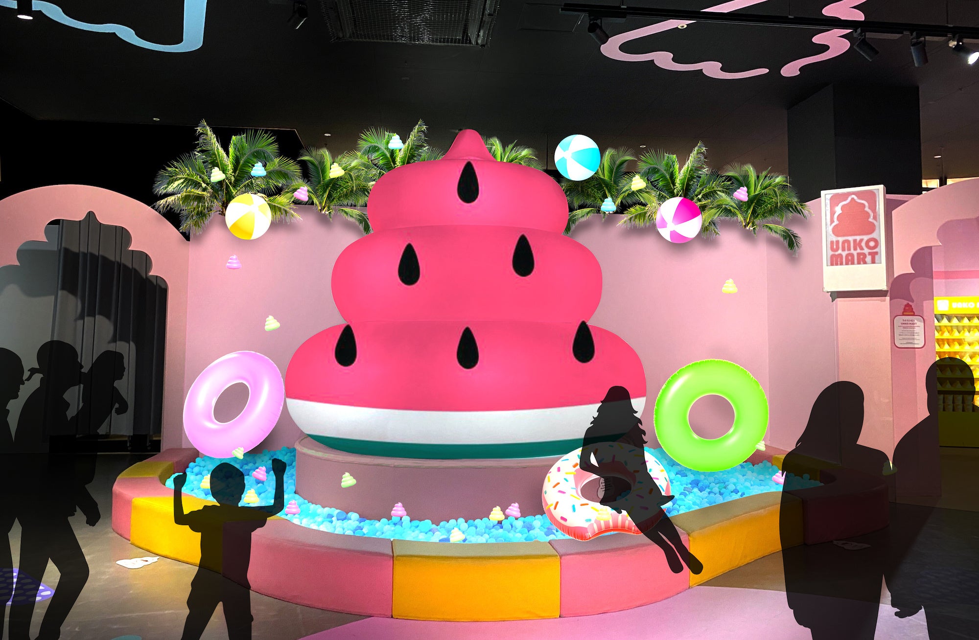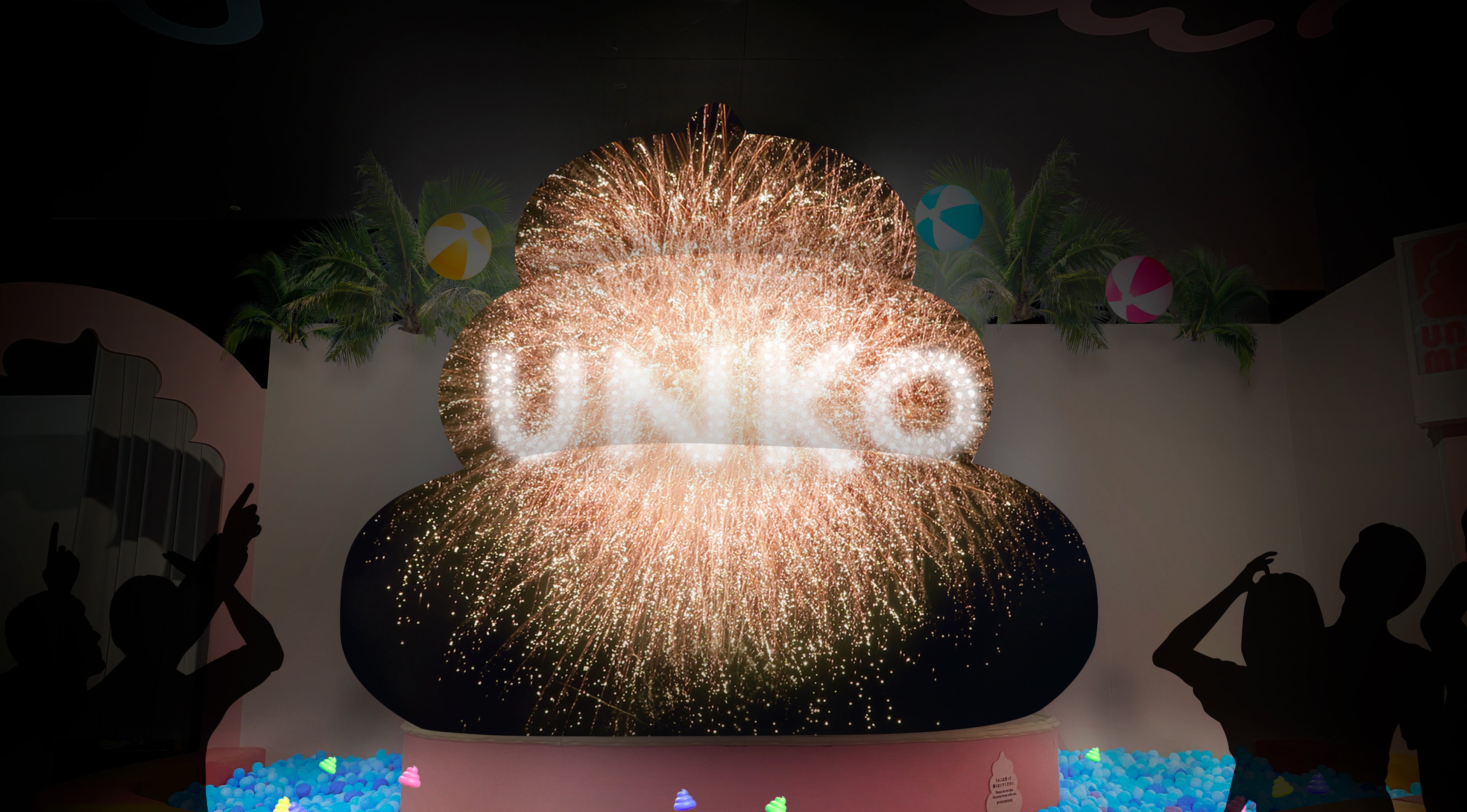 ウンコ・ボルケーノの周辺を彩るボールプールが、涼しげな水色の「うんこサマープール」に大変身。プロジェクションマッピングにはこの夏だけの映像が追加となります。