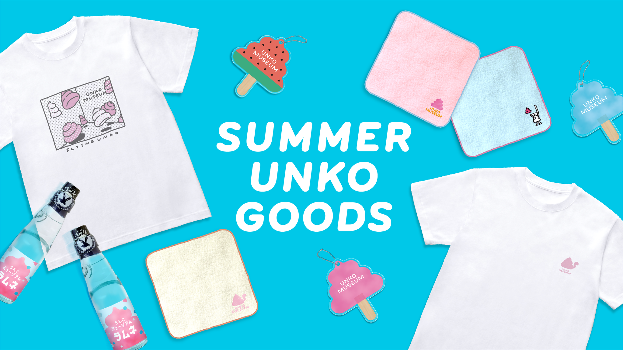 うんこミュージアム限定ラムネ、うんこアイスキーホルダー、人気コンテンツ・フライングうんこをモチーフにしたTシャツなど、新グッズが登場します。サマーうんこグッズを身につけて夏のイベントを楽しめば注目度抜群!