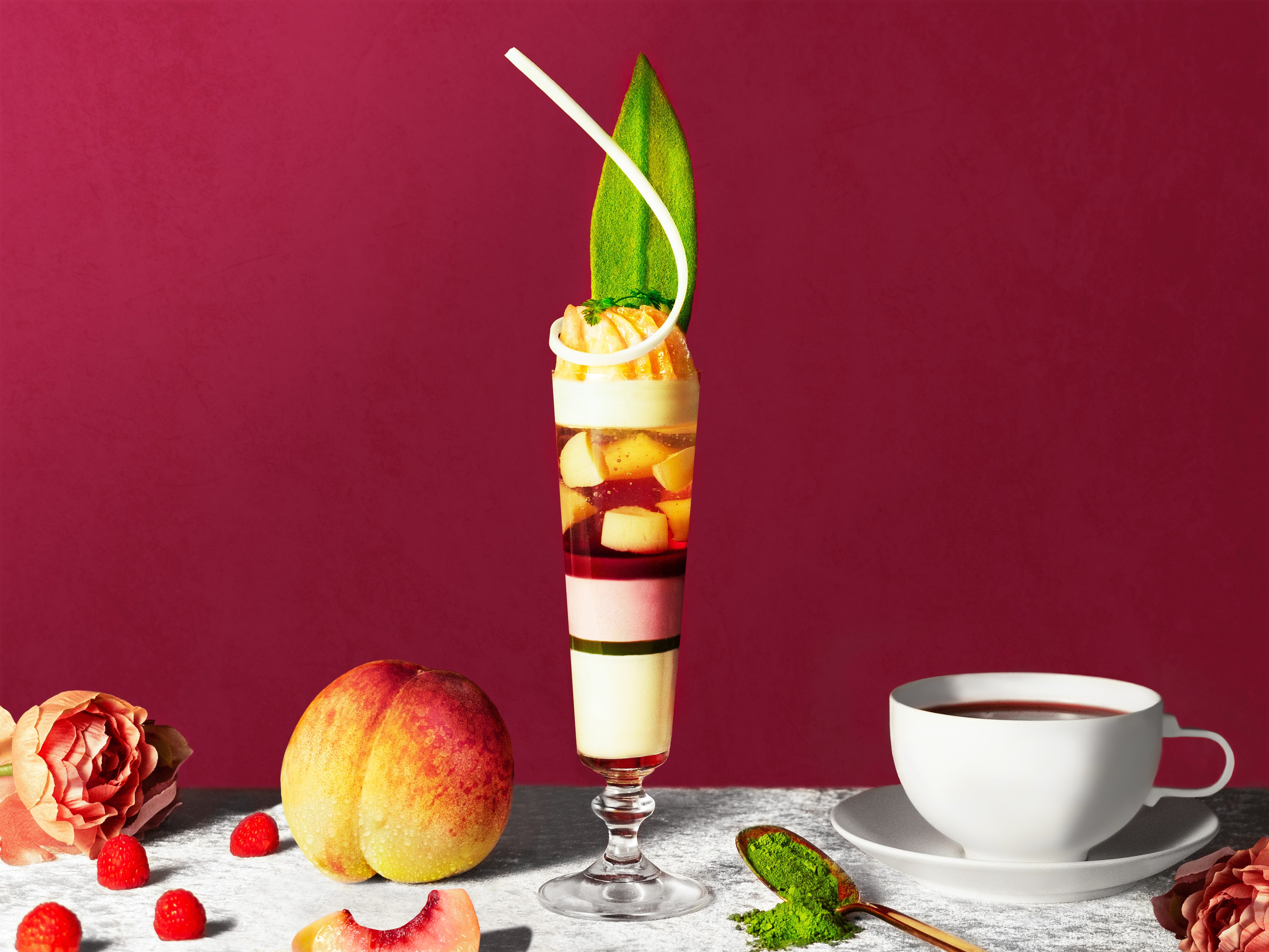 一層目は、濃厚なバニラクリームをたっぷり使用しまろやかな風味を、二層目は、優しい味わいの桃のジュレと桃のコンポートで優雅な甘さを作り出しています。三層目のフランボワーズジュレと、四層目の赤桃ムースがキリっとした酸味を感じさせ、下の層の抹茶ジュレの苦みと香りが味覚をリセットします。最後の層には白桃ムースを詰め、桃の風味を最後まで存分に楽しめます。