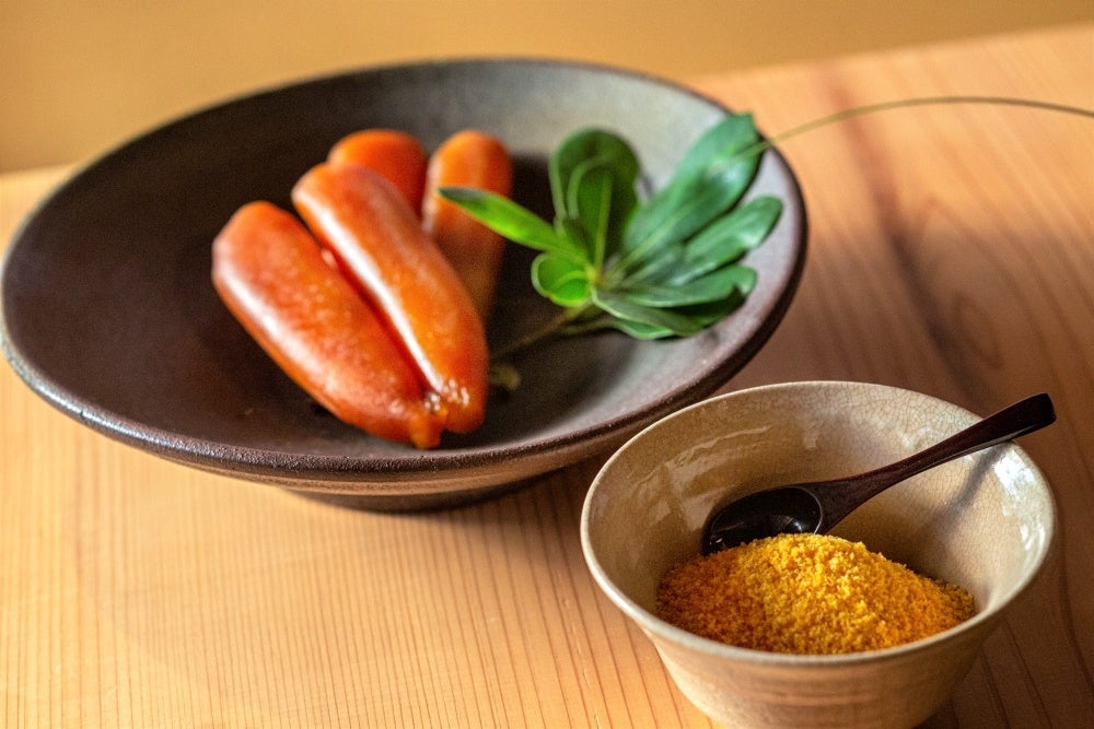 姫路沖の坊勢島(ぼうぜじま)からボラの卵巣を仕入れ、塩漬け・乾燥させた自慢の逸品です。スライスされたからすみは、ねっとりと濃厚な味わいを、パウダーは芳醇な香りがお楽しみいただけます。