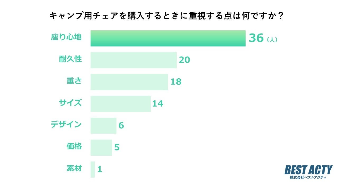 キャンプ用チェアを購入するときに重視する点について100名にアンケートを行ったところ、「座り心地」と回答する人が最も多い結果となりました。