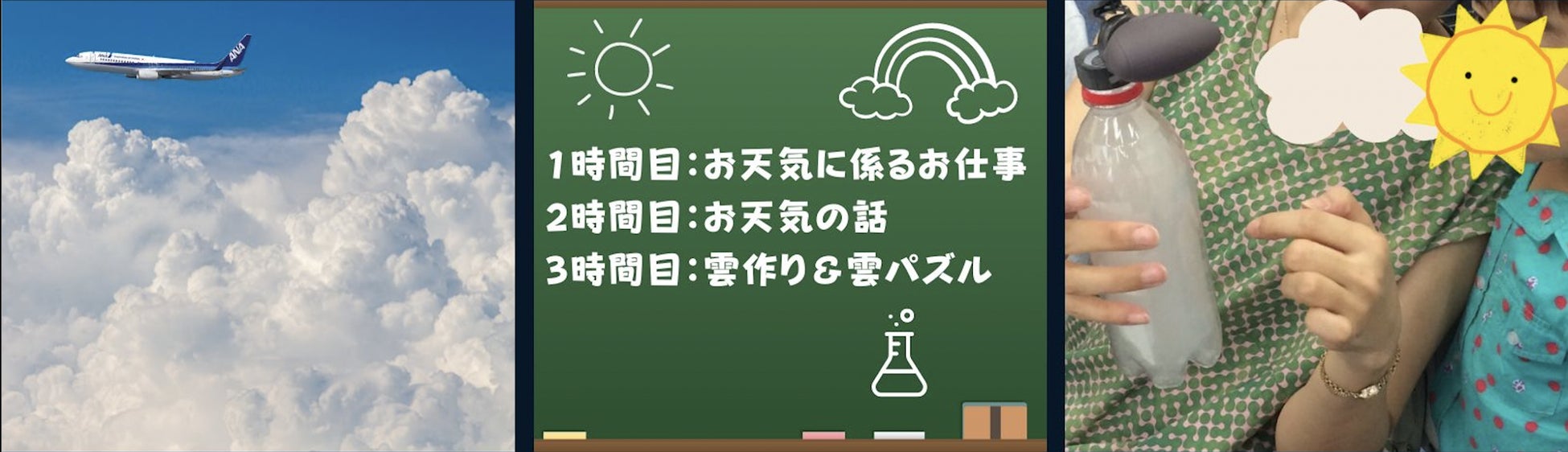 ANAブルーベース(東京都大田区)で実施する「会場開催」へのご参加者は、オンライン講座を視聴いただいた後に、一般社団法人気象予報士学会サニーエンジェルス様の協力のもと、「ペットボトルで雲作り」や「雲パズル」の体験学習をお楽しみいただけます。