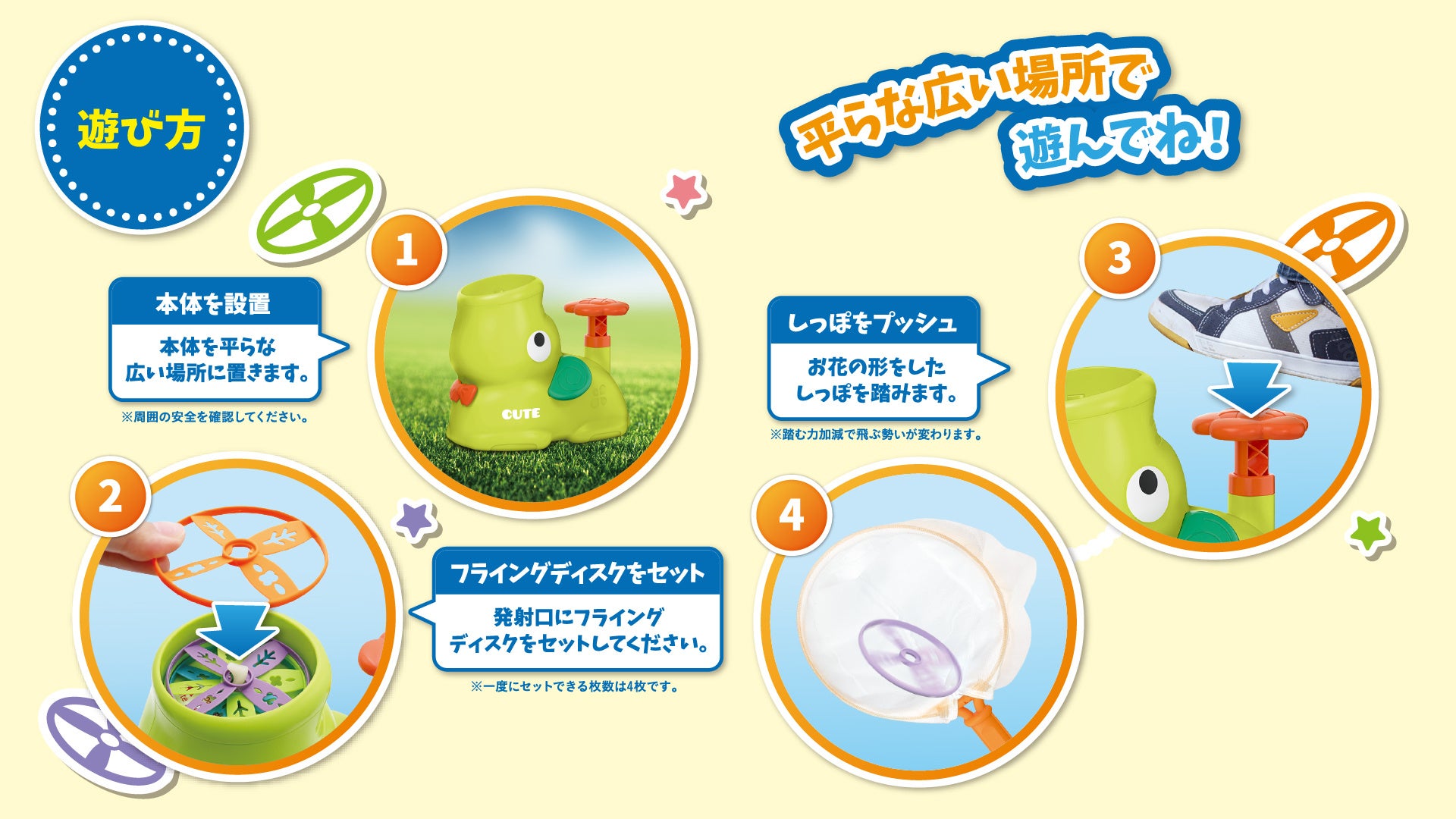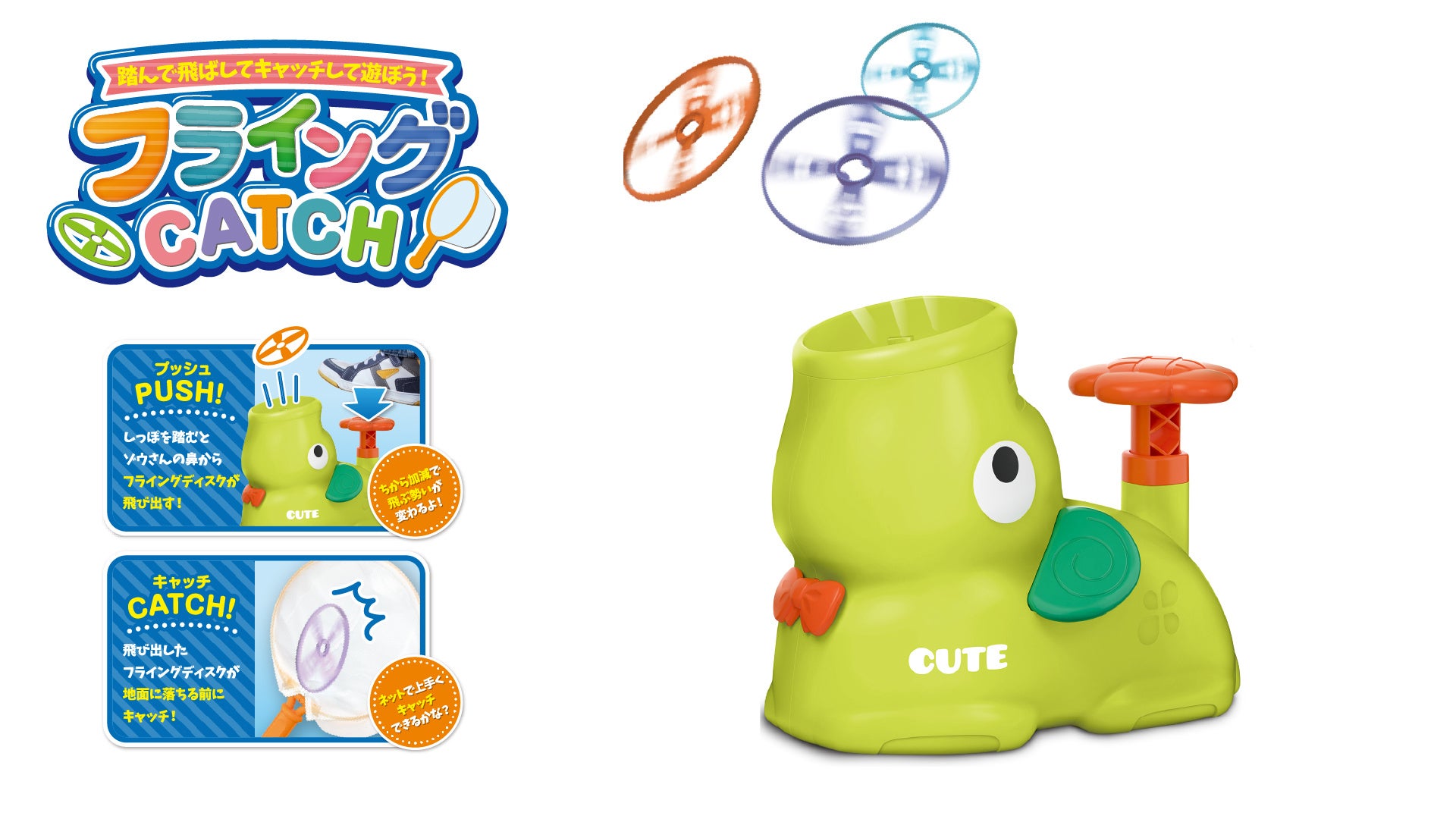 特徴:踏んで飛ばしてナイスキャッチ!!しっぽを踏むとゾウさんの鼻からディスクが飛び出す!付属のキャッチネットで地面に落ちる前にキャッチしてみよう。