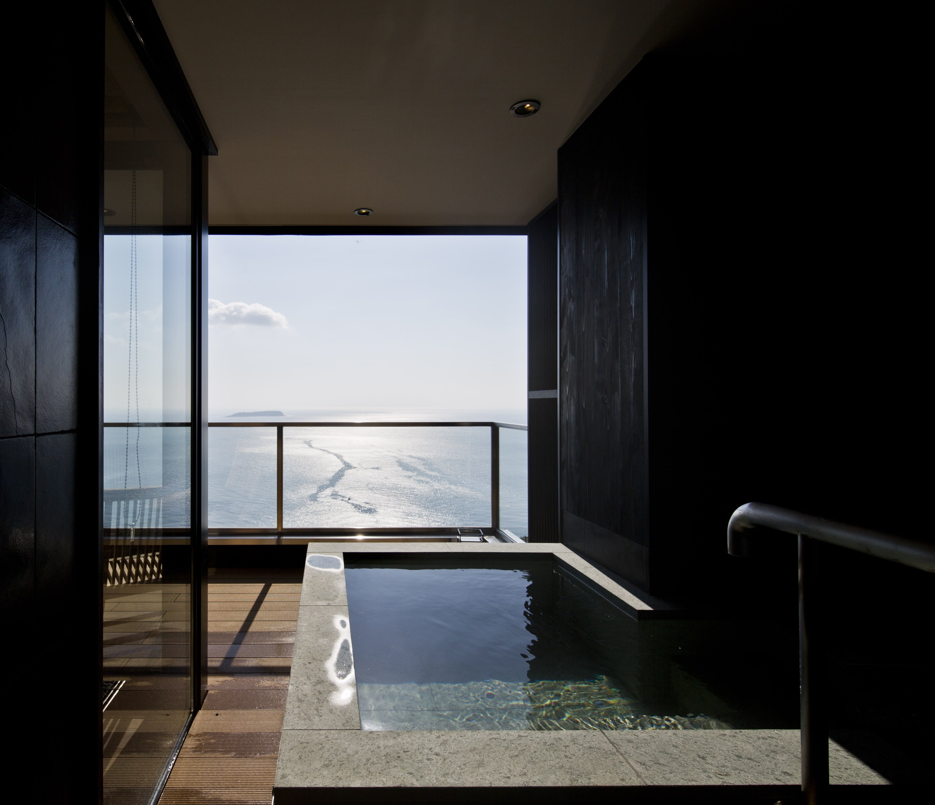 ヴィラ内にあるヒノキで作られたバスルームからは、海を⼀望でき、⽇常から開放された気分に浸れます。