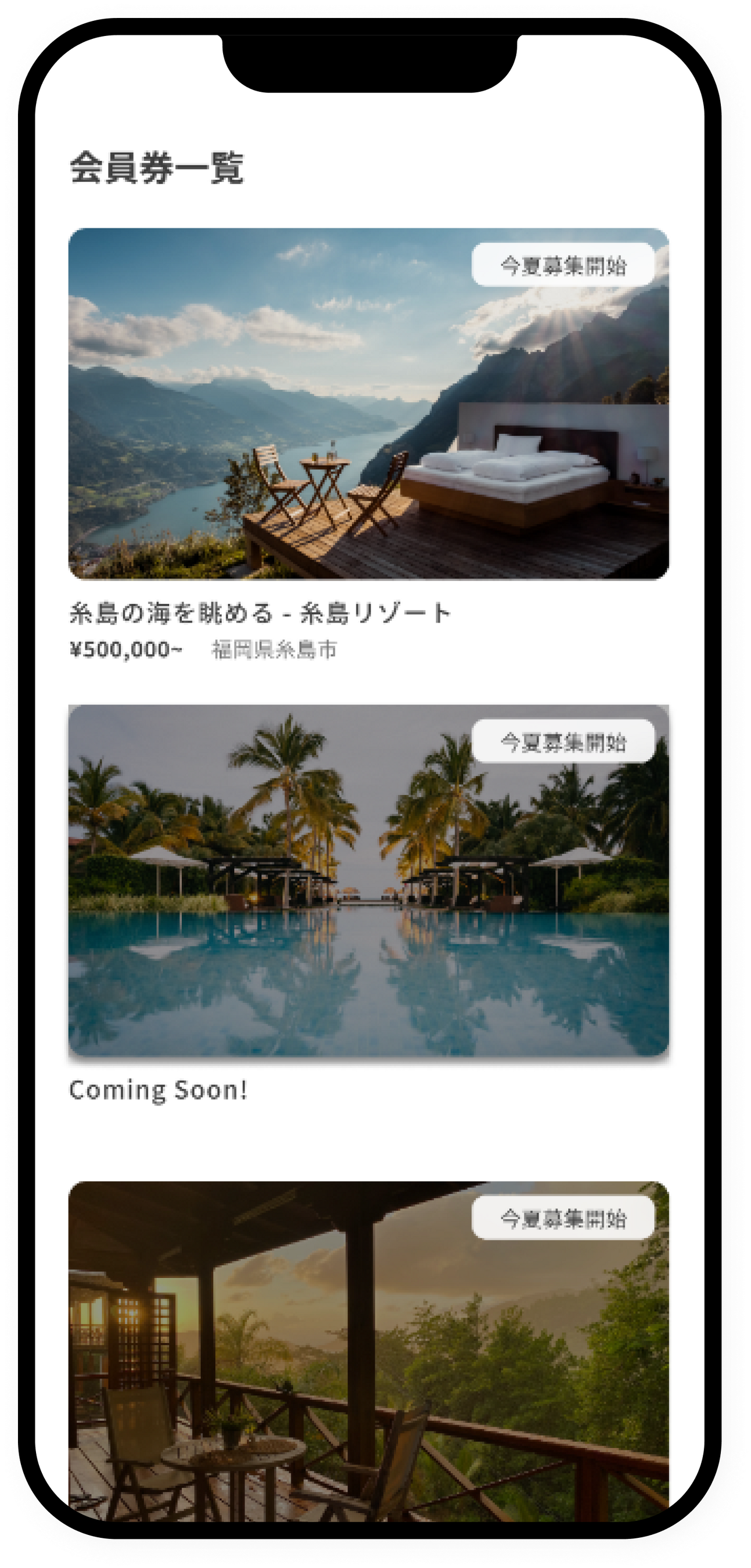 トップページのリストからお気に入りのリゾート施設を選択し、詳細ページから会員権を購入します。支払いは現在クレジットカードおよび銀行振込決済に対応しています。