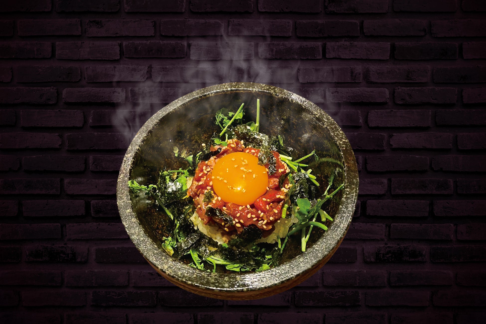 出汁焚きご飯と炙りフィレユッケの究極ビビンバです。濃厚な味わいが楽しめる茨城県産奥久慈卵黄使用