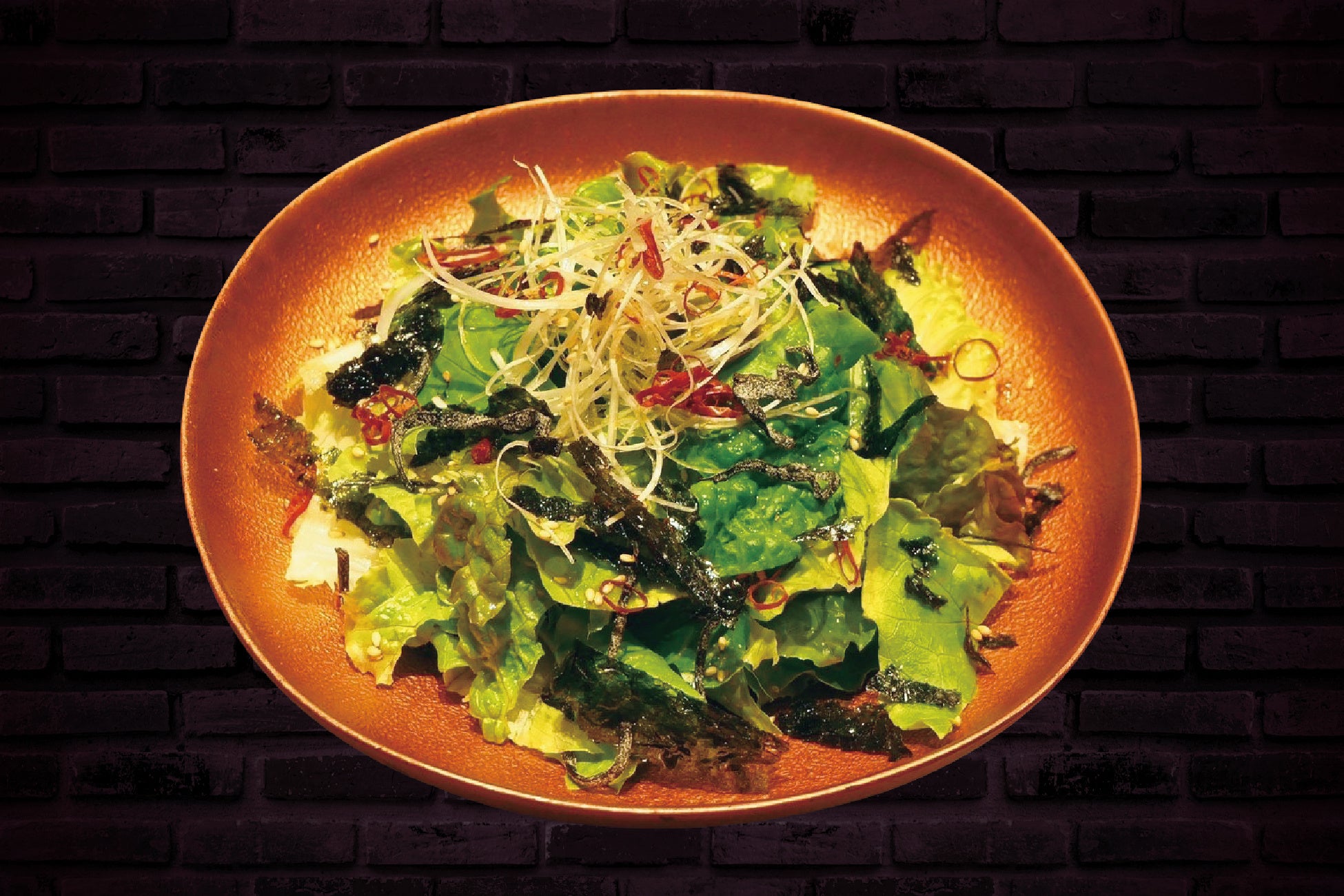 サニーレタス、ロメインレタス、長ネギの定番野菜に塩昆布、韓国海苔、自家製チョレギドレッシング使用したサラダです