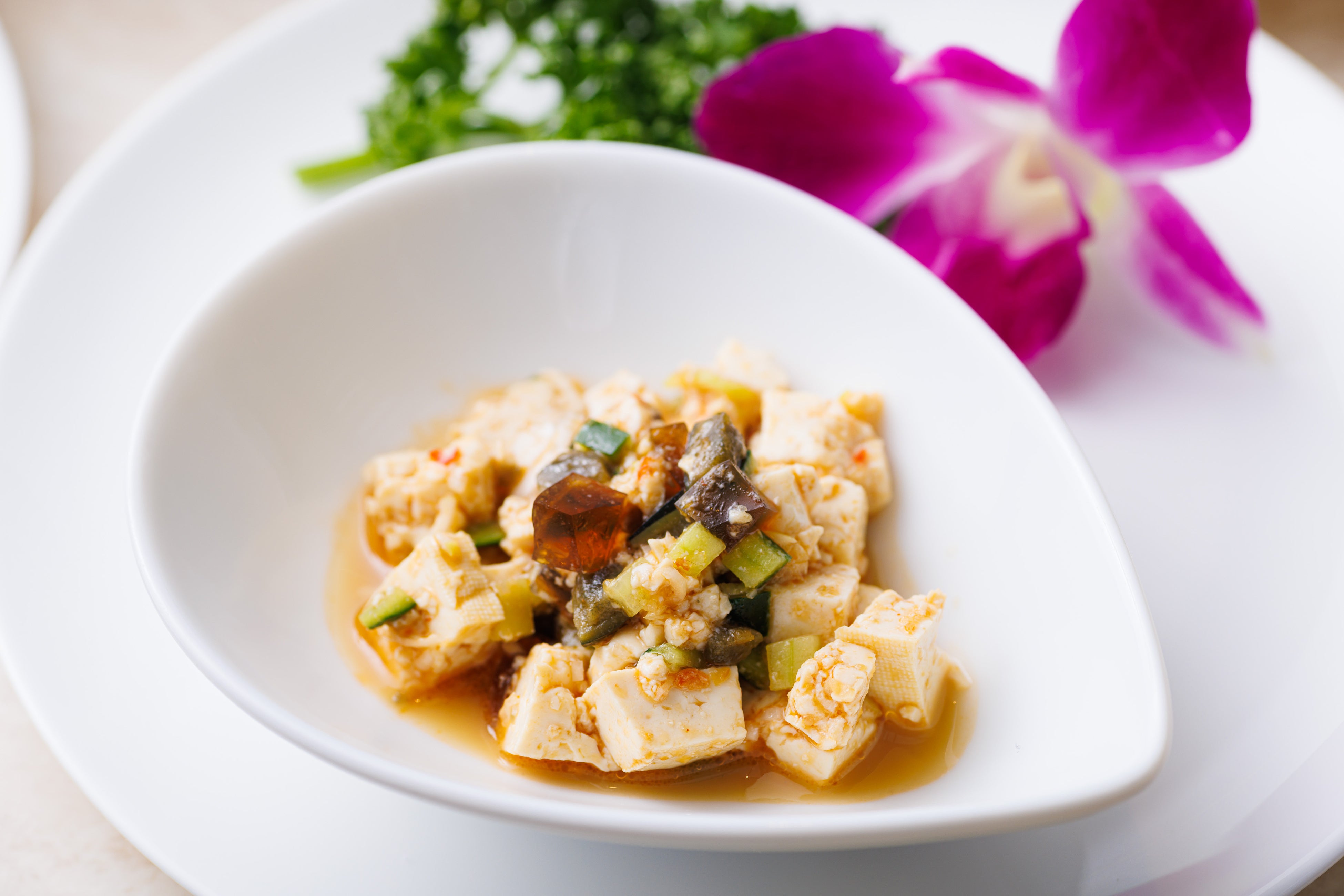 中華珍味のピータンと豆腐のピリ辛和え。ご飯にもお酒にも合う一品。