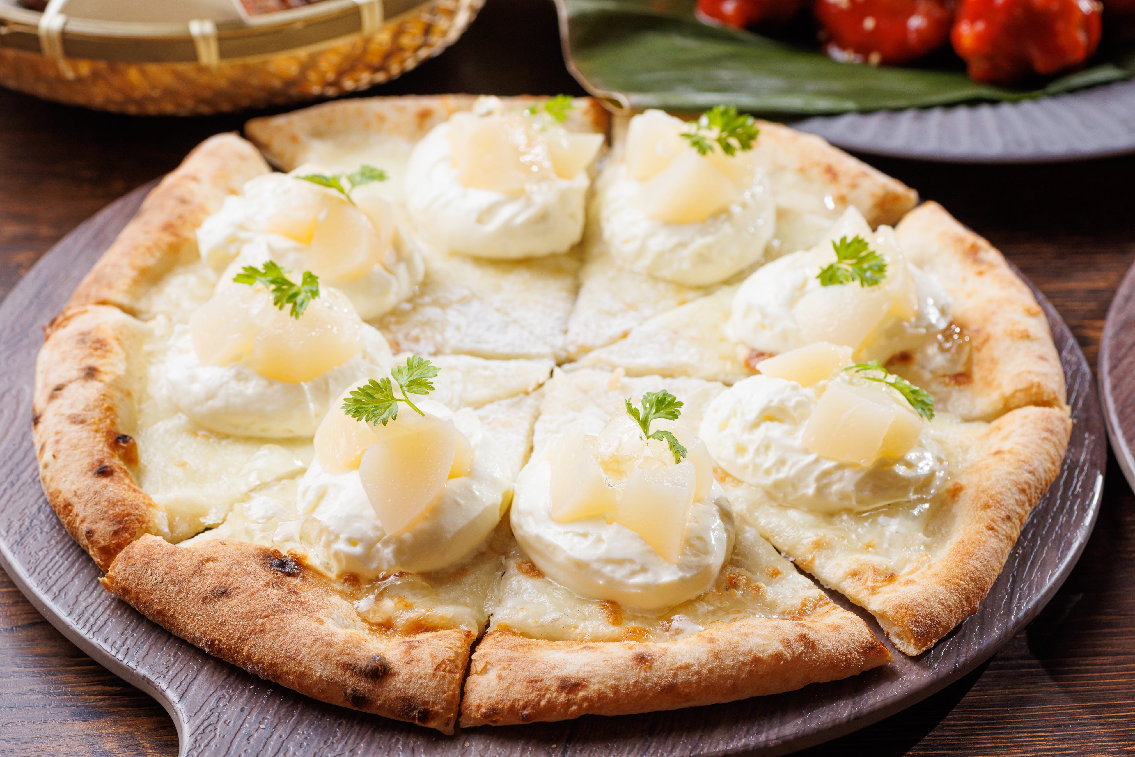 シーダパレスの象徴である石釜焼きのピザ。「夏」のデザートピザは、旬を迎える桃を使用しています。甘酸っぱい桃と、ピザ生地の塩味、甘いクリームのマリアージュをお楽しみください。