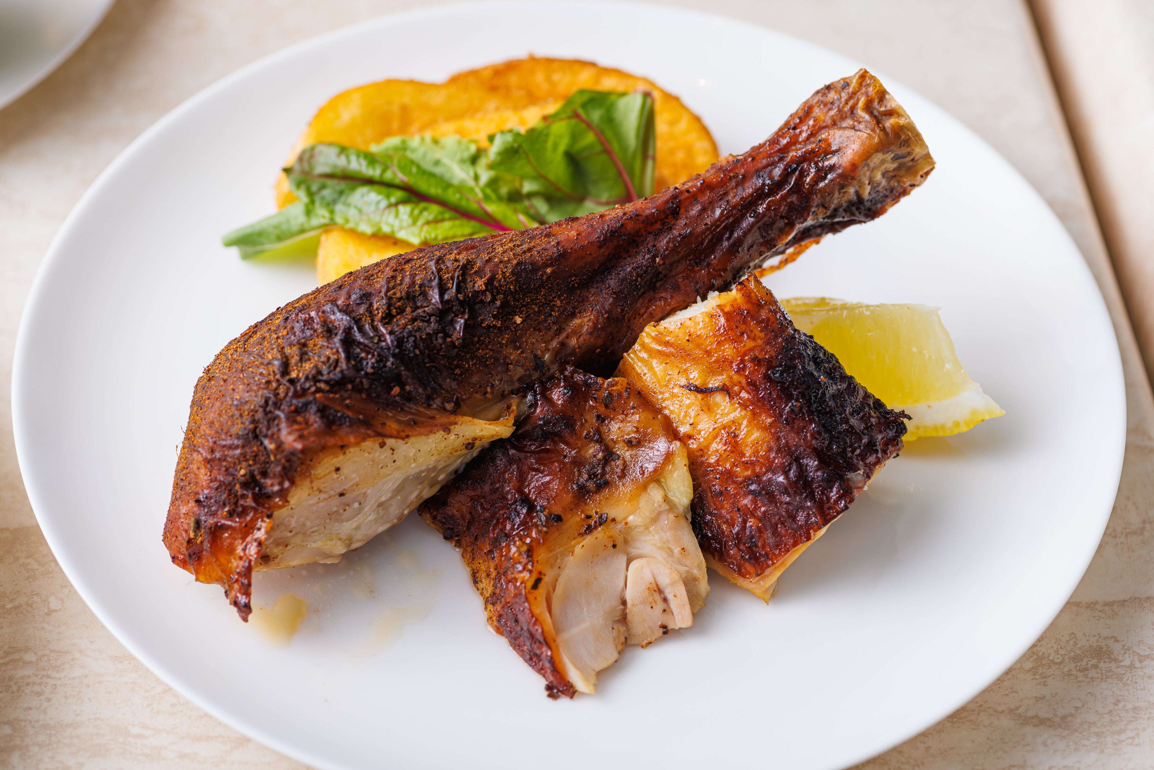 TERRACE & DINING SORAの象徴であるロティサリーチキンにスパイシー味を追加。みつせ鶏の丸鶏を半日かけて味をいれ、オリジナルで合わせた香辛料をまぶしています。ロティサリーマシーンで焼き上げ、香り豊かにスパイシーに仕上げた一品です。