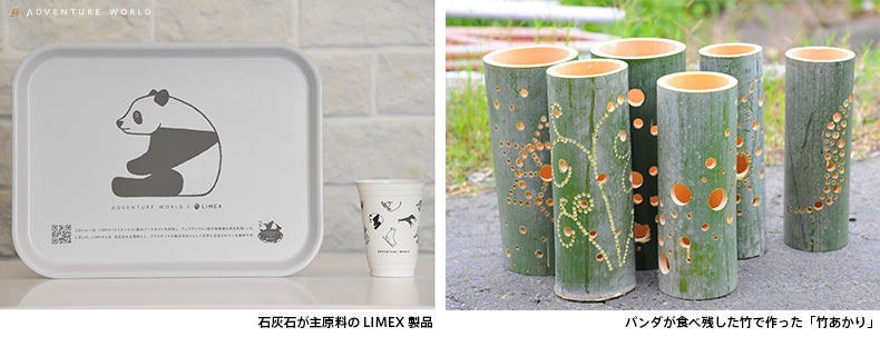 パンダが食べ残した竹をアップサイクルした竹あかり、タンブラー、装飾品(リング、イヤリング)、アオリイカ産卵床サンプルなど。