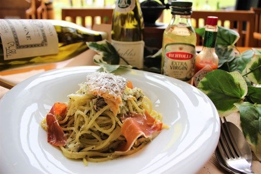 スキージャム勝山では、サステナブルな取り組みの一つとして、レストランでの地産地消を積極的に行っています。今回新登場する「鮎と魚醬の蓼ジェノベーゼ『ふくこむぎ』のスパーゴ和え」には、福井県立大学で開発された小麦「ふくこむぎ」を用いた生パスタを使用しています。
