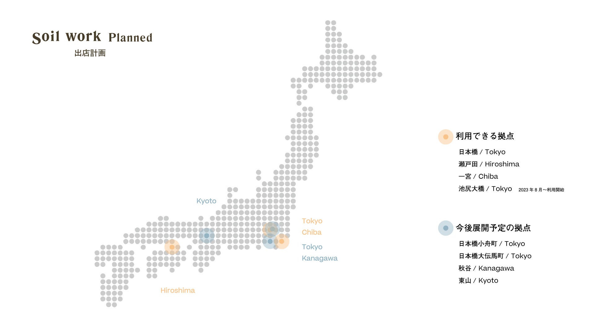 Soil workは、現在利用可能な日本橋(東京)、瀬戸田(広島)に加えて、今後一宮(千葉)と池尻大橋(東京)でサービスの利用を開始します。また、日本橋エリアに2店舗、秋谷(神奈川県)と東山(京都)にも拡大を計画中。拠点についての最新情報はSoil workのWebサイトで随時更新中です。