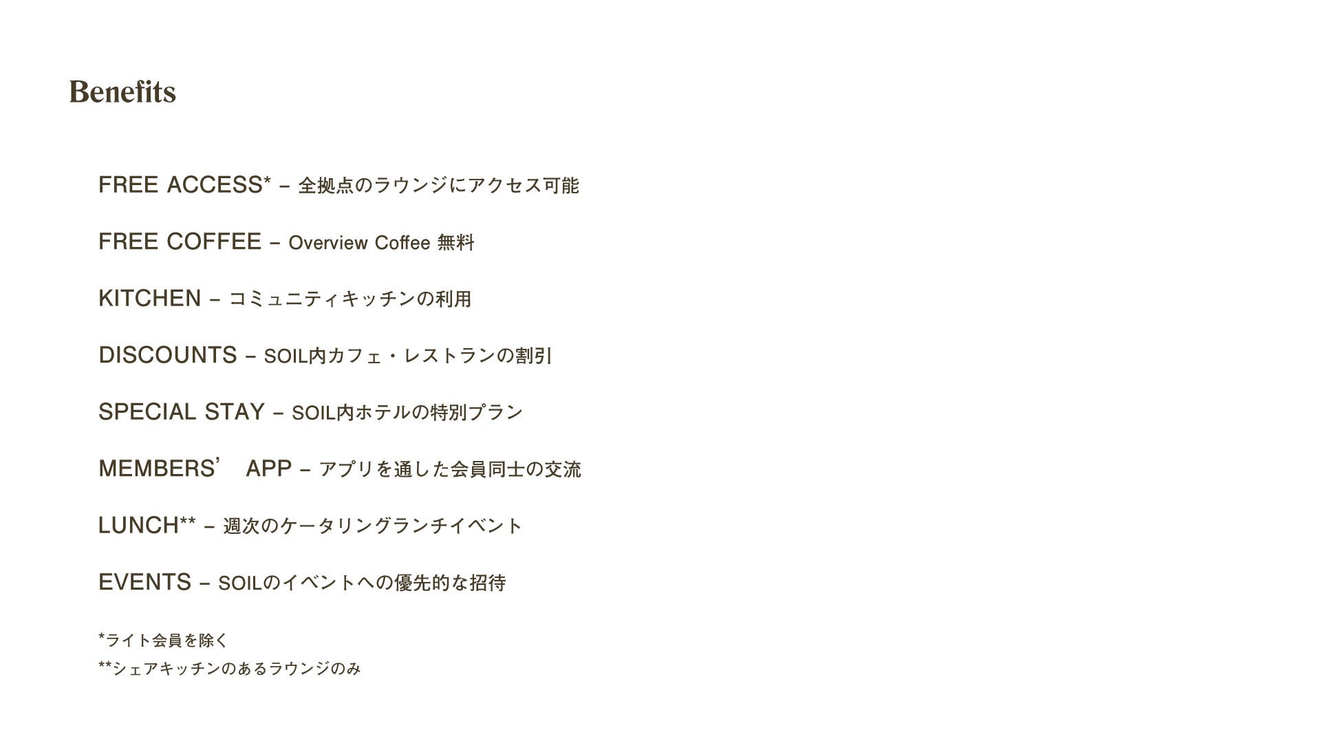 Soil work会員は、SOIL Setoda(宿泊施設)やParklet(ベーカリーカフェ)など提携先での割引や、イベントへの優先招待など、さまざまな特典があります。