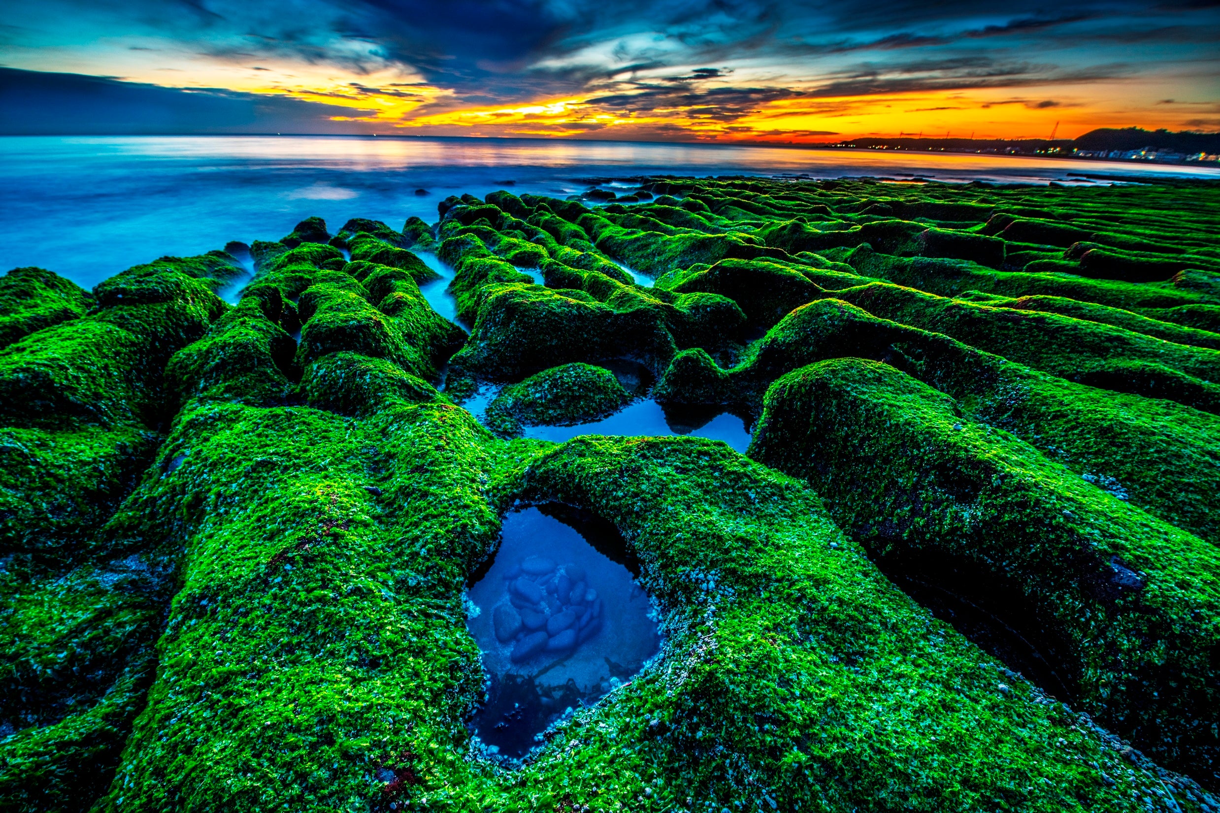 毎年3月中旬から5月上旬にかけて、石門岬は湾緑色の海藻に覆われた「海蝕溝」と呼ばれる地形が姿を現します。緑色の岩が並ぶ姿はまさに奇観でCNNの「台湾の8大秘境」に選ばれています。