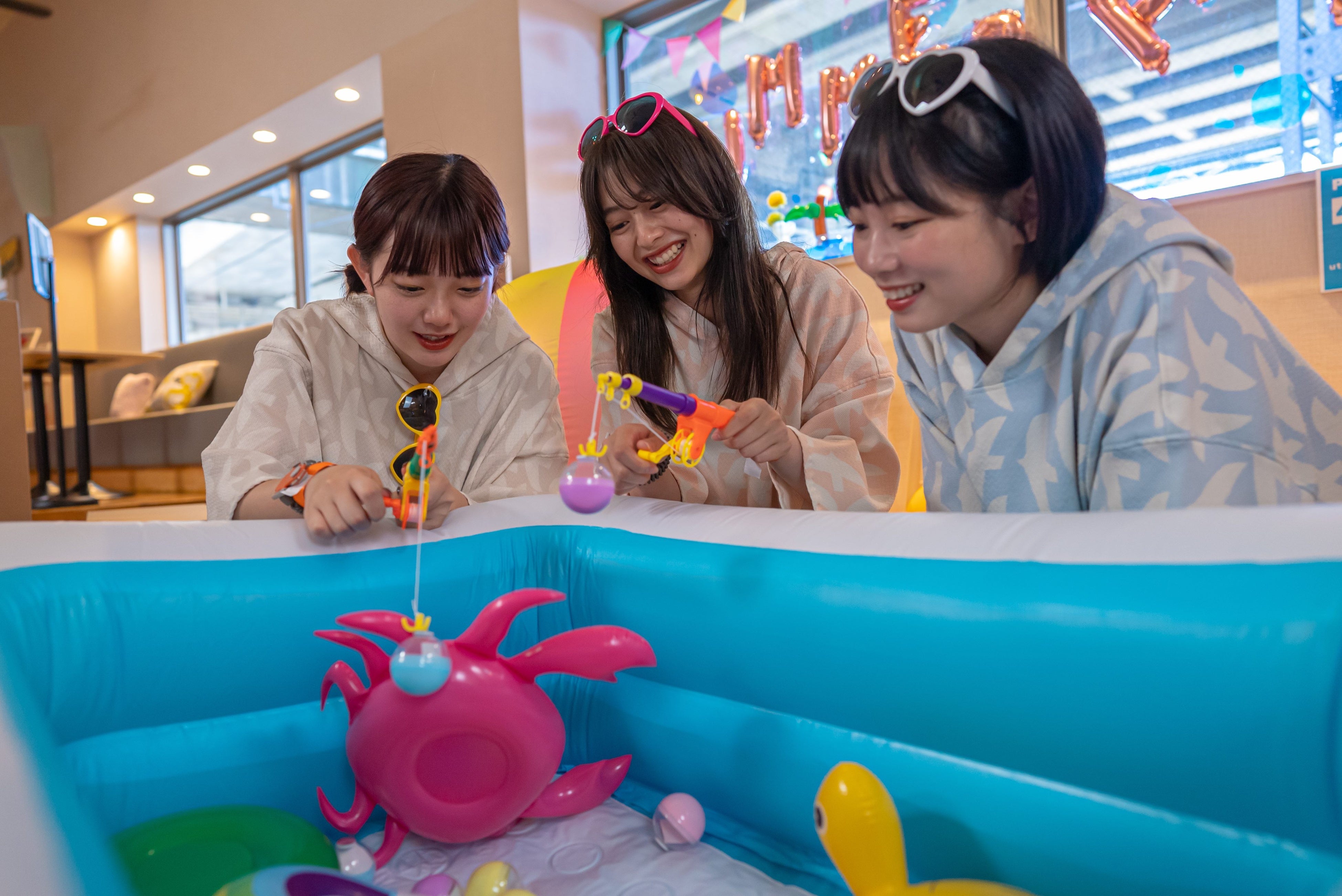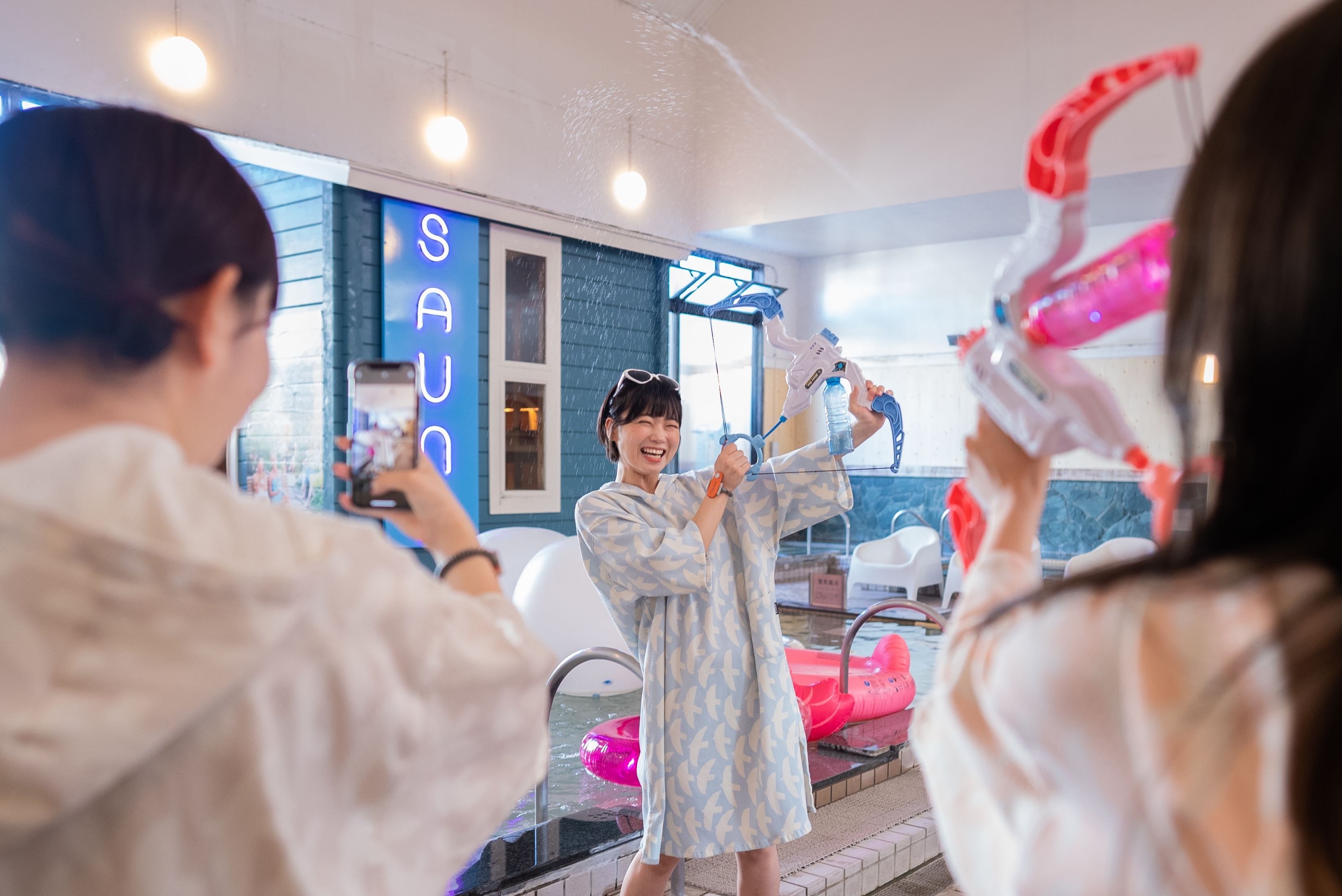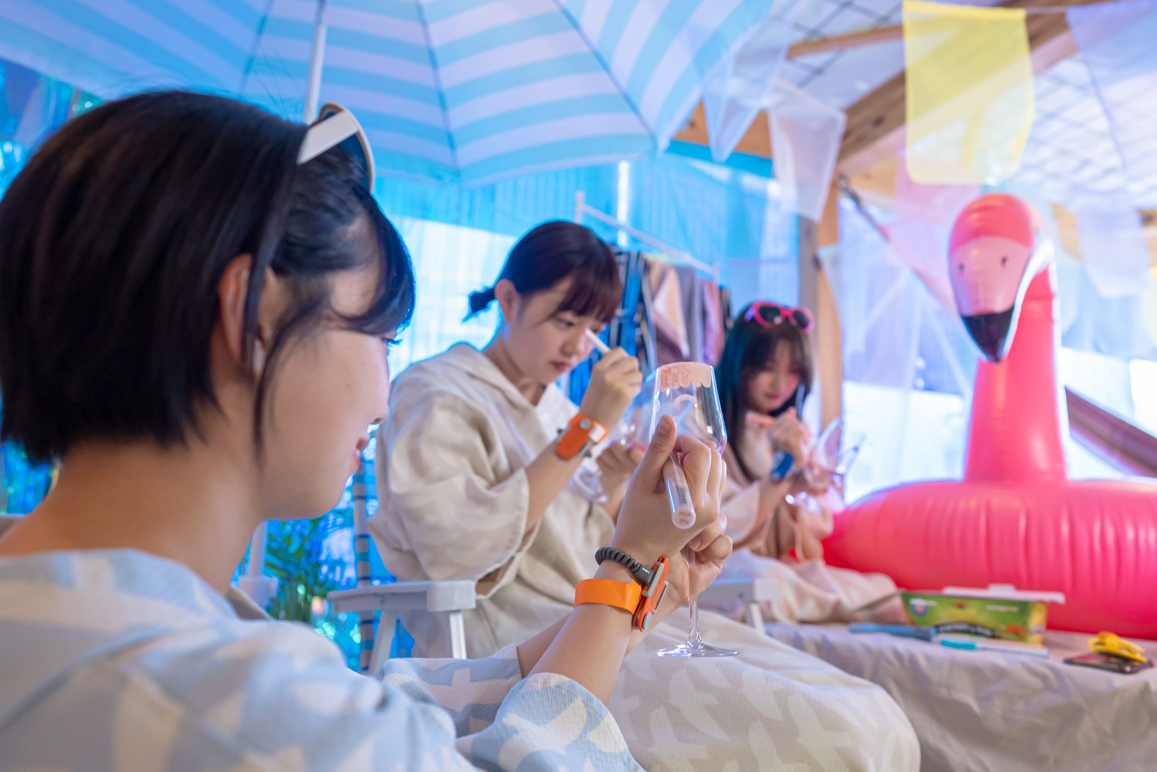 まるでビーチサイドのような館内の装飾に加えて、パジャマ姿でパーティーのように楽しめるイベントを随時開催。巨大ジェンガ対決や、釣りおみくじなどのミッションを攻略する「パーティーミッション」や、毎週土曜深夜限定で水着で男女一緒にサウナ・泡パーティー・水鉄砲などが楽しめる「ナイトサウナ」など、この夏を楽しみつくすイベントが盛りだくさんです。
