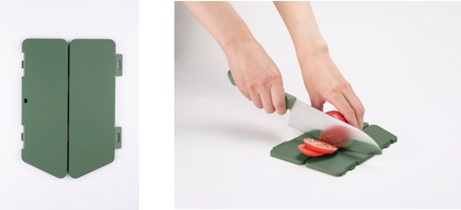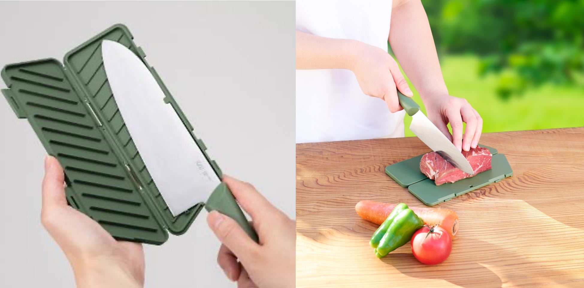 加えて、大きく開閉できるサヤは、広げると簡易まな板としても使用できます。