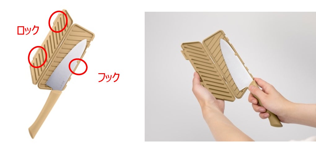 外側2か所のロックと内側のフックで包丁をしっかりと固定し、安全に持ち運べることができます。