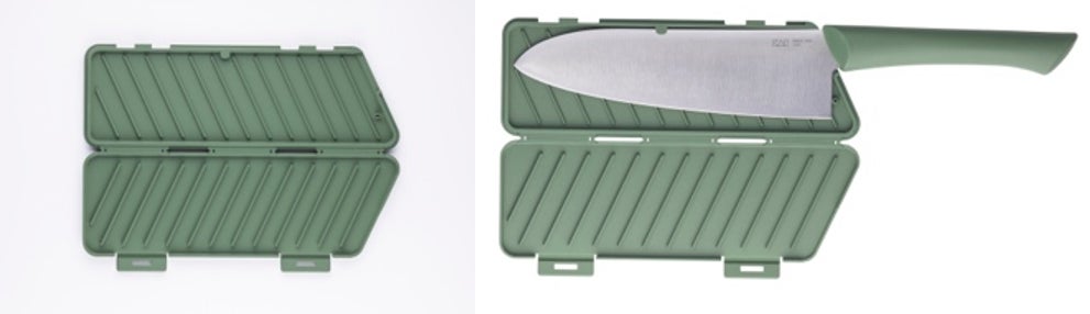 包丁を安全に収納できるように、収納時のガタ付きの抑え方や、ロック部の硬さ(硬すぎず、柔らかすぎず)、蓋を開けた時に勝手に落ちないようにする、何度も開閉するのでヒンジ部の強度や、まな板として使用する際にガタガタしない、ロック部分が邪魔にならないなど、細部にもこだわり設計に時間をかけた商品です。