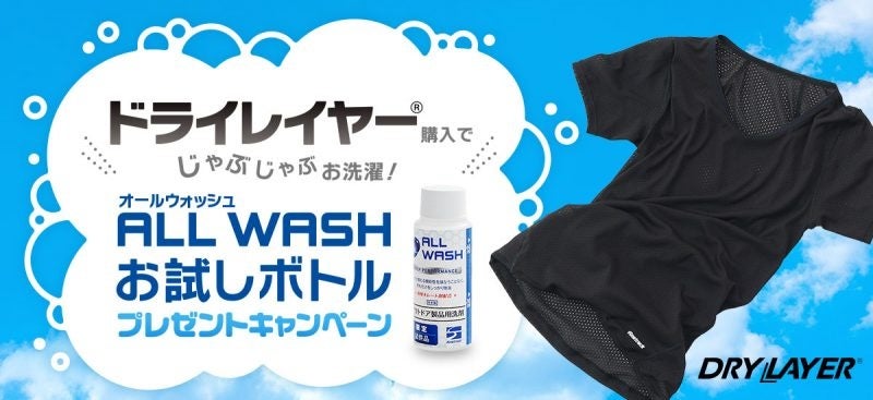 finetrack直営店&公式WEB STOREでは、アウトドアでの汗による”冷え”や”ベタツキ”を軽減する撥水アンダーウエア「ドライレイヤー」を購入いただいた方に、アウトドア製品用洗剤「オールウォッシュ」のお試しボトル(内容量 60ml・約2回分)をプレゼントするキャンペーンを開催いたします。