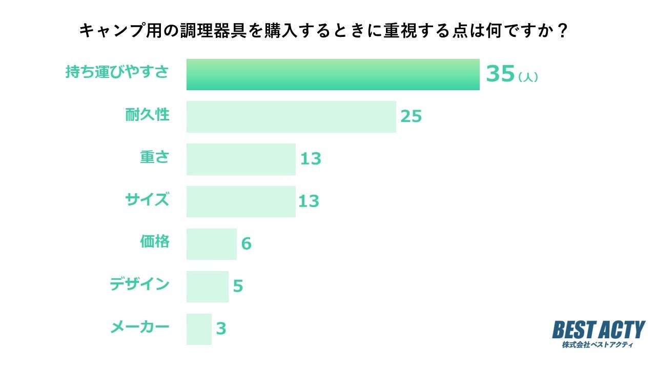 キャンプ用の調理器具を購入するときに重視する点について100名にアンケートを行ったところ、「持ち運びやすさ」と回答する人が最も多い結果となりました。
