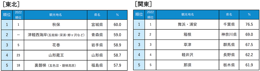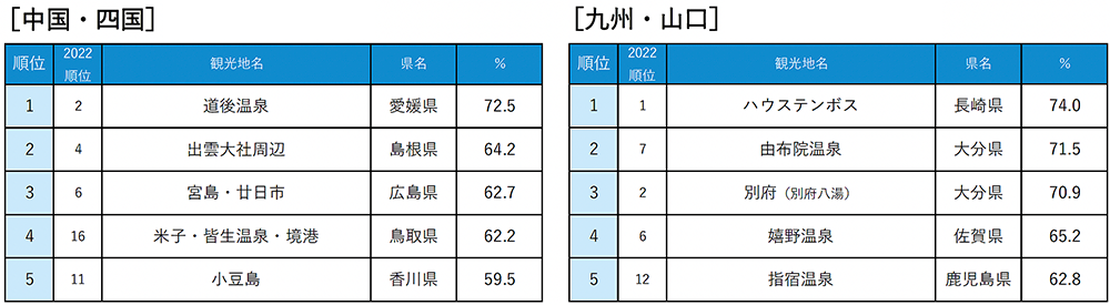 2022年順位「ー」は来訪者30人未満の観光地(ランキング対象外)