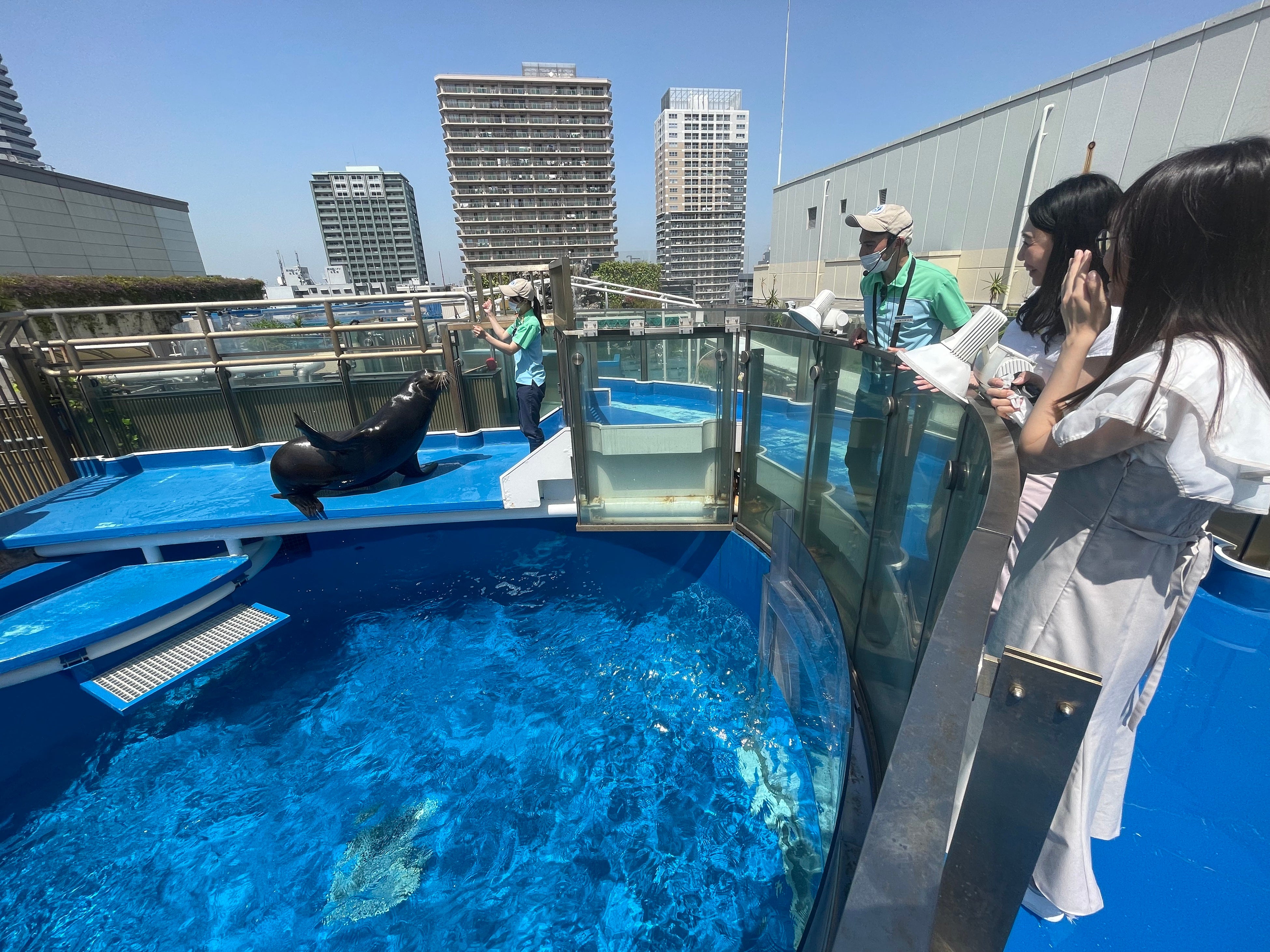 通常は下から見上げる「サンシャインアクアリング」水槽の目の前までご案内!展示面とは異なる角度からアシカを至近距離でご覧いただけます。