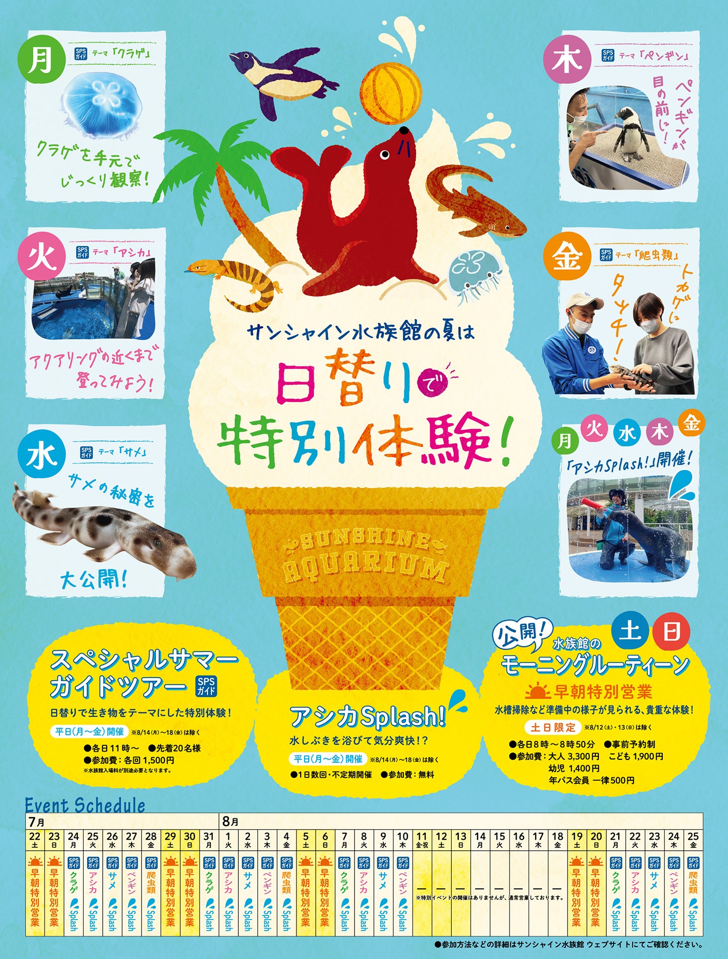期間中の平日(8月14日(月)~18日(金)を除く)限定で、曜日ごとに異なる生き物に特化した内容でお届けする「スペシャルサマーガイドツアー」を実施するほか、普段行っているアシカトレーニングを夏特別ver.「アシカSplash!」としてお届け。「びちょぬれゾーン」を設け、水鉄砲や噴水等を使った清涼感たっぷりな夏仕様の演出で実施します。