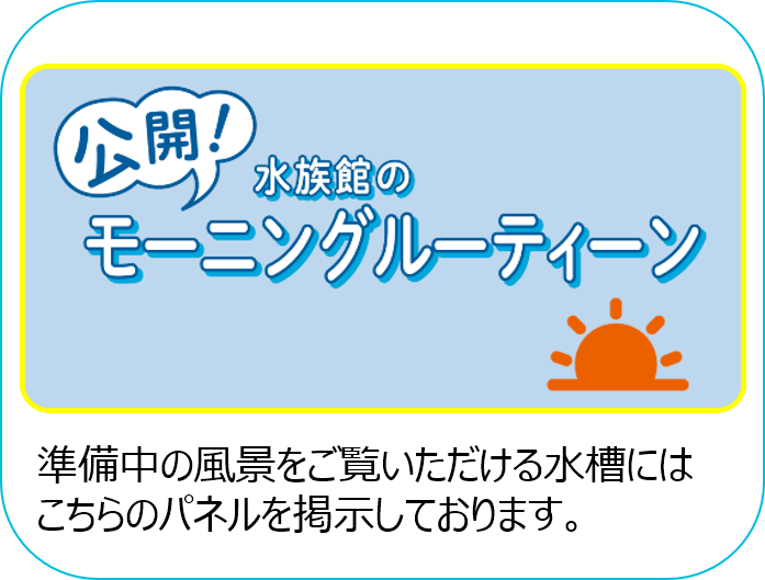 水槽掃除の様子をはじめ、普段は見られない準備中の風景を特別にご覧いただけるほか、一部の作業を飼育スタッフの解説付きでお楽しみいただけます。普段は見られない開館前の作業中の水槽にはパネルを掲示しておりますので、是非パネルを探してみてください。