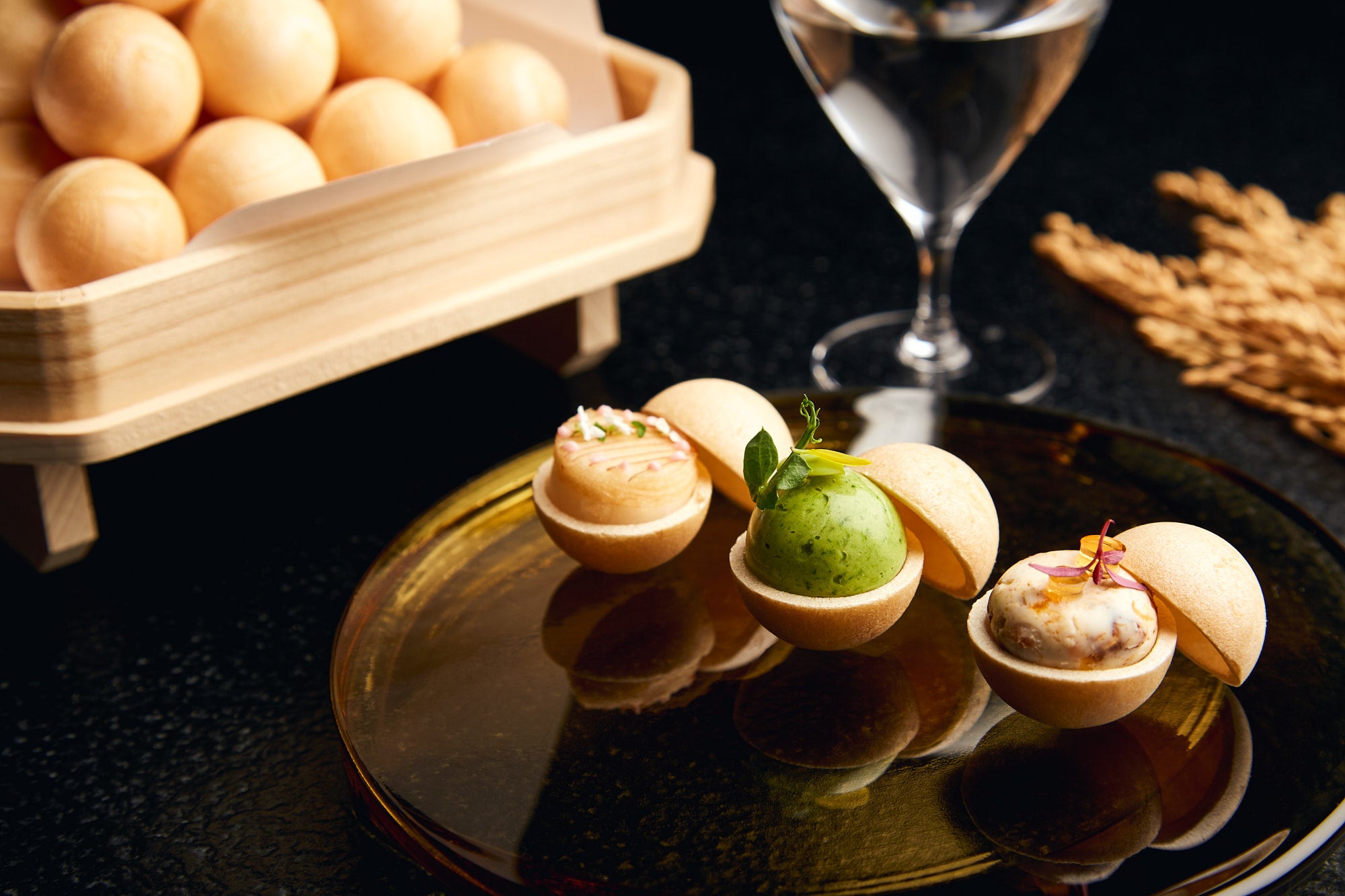 舟の上では、月の満ち欠けの周期に基づいた「太陰暦」を基に造られた日本酒と3種の月見最中を楽しめます。提供する日本酒は、小浜酒造の「五芒星(ごぼうせい)」です。古くは酒の醸造や農作物の栽培には太陰暦が活用されていたと言われており、「五芒星」は、醸造開始日、酒母米の初蒸し日、初添え、仲添え留添え、上槽、火入れ、瓶詰めなど醸造の全行程は、旧暦の暦上の吉日に行われ、造られています。(*2)日本酒とあわせて提供する最中は、月見団子に見立てた月見最中です。最中の名前の由来は、平安時代に月見の宴で出された餅菓子が、仲秋の名月(秋の真ん中、十五夜の月)を彷彿とさせたことから「最中の月」と呼ばれたことにあります。江戸時代にその菓子にちなんで、もち米を蒸して焼いた干菓子に餡を挟んだものが売られるようになり、現在の最中の起源となりました。(*3)1つめの最中は、旬の柿にクリームチーズと焼いた酒粕をあわせた最中です。2つめは、里芋と枝豆の最中です。里芋と甘栗のペーストと、枝豆のピューレを合わせて仕立てました。3つめは、コンソメで炊いた大根にりんごのスライスを添えた最中です。米本来のふくよかな味わいが特徴の日本酒と、もち米を焼き上げた最中の皮の香ばしさがよく合います。