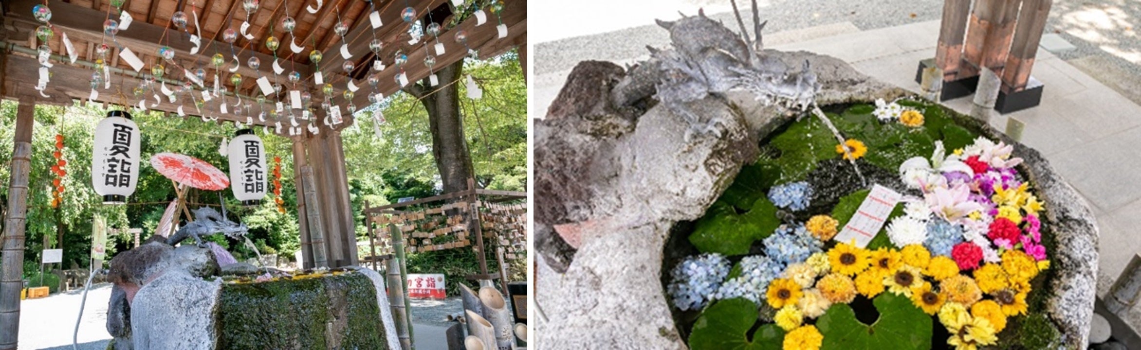 真夏の最中、手水舎の冷たい地下水でお浄めしていただけます。境内には、爽やかな音色が響き渡る夏風鈴や花手水、湧水ミストシャワーでおもてなしします。さらに、水に浮かべると運勢が浮き出る、夏にぴったりの涼しげな「水みくじ」も販売いたします。
