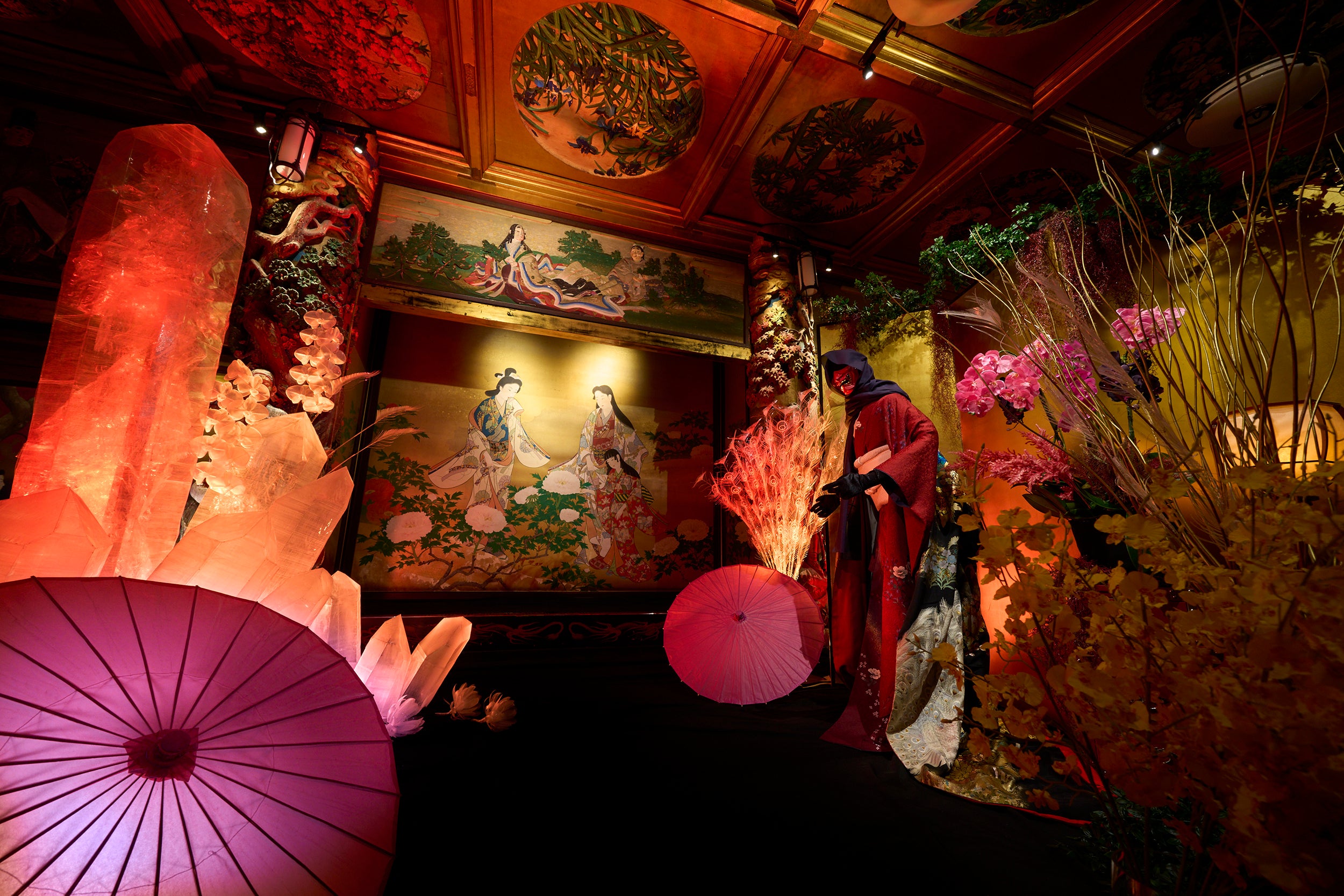 「極彩色の百鬼夜行」をテーマに、さまざまなジャンルや技法によるあかりアートの間に妖怪たちが顔を覗かせ、美しくも妖しい世界へと誘います。
