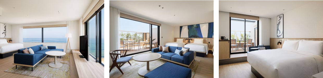 左からオーシャンビューの広めのキングルーム、ご家族やご友人とごゆっくりお過ごしいただける4シングルルーム、スタンダードのお部屋の海側にテラスを備えたオーシャンテラスルーム(キング)