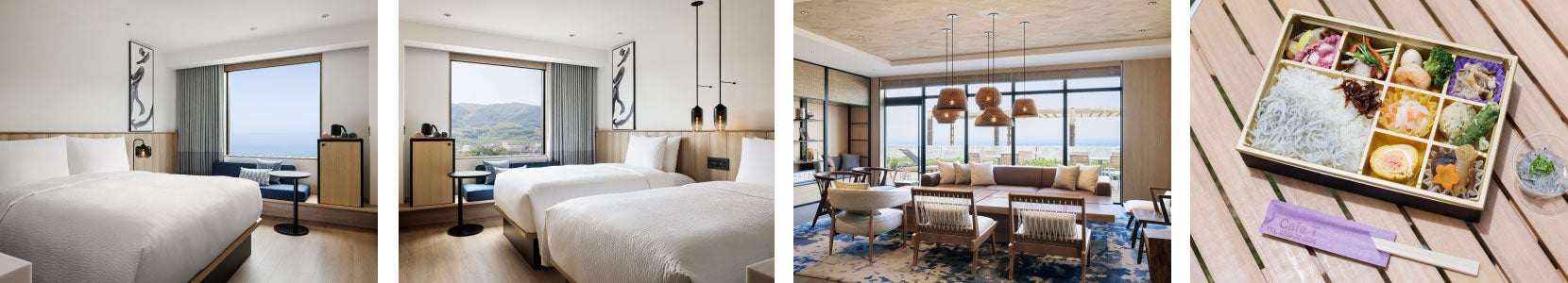 左からスタンダードのキングルーム(海側)、スタンダードのツインルーム(山側)、ロビー、淡路島の魅力が詰まった朝食ボックス