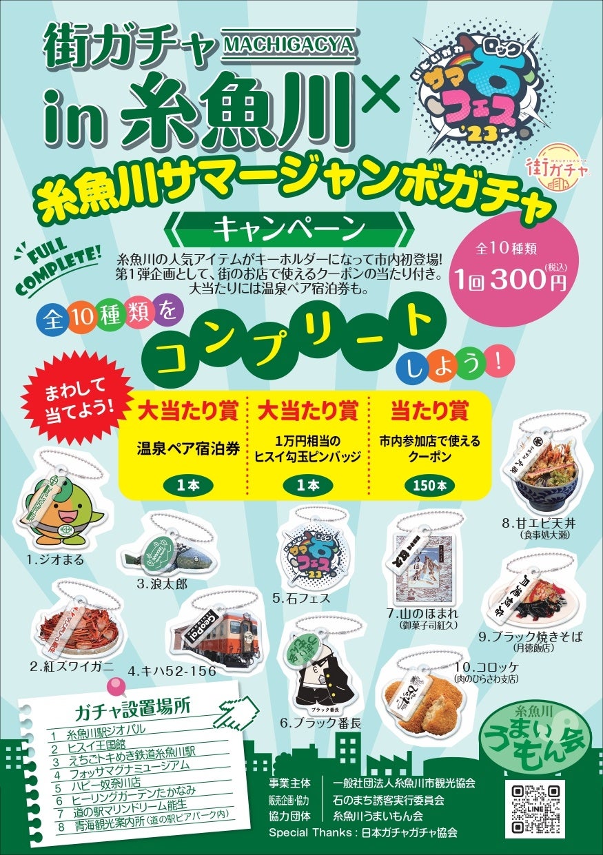 今回初となる糸魚川市「街ガチャ」設置を記念して” 糸魚川サマージャンボガチャ” と銘打ち、「温泉ペア宿泊券」や県石翡翠の「ヒスイ勾玉ピンバッチ」市内の参加店で使えるクーポンなどを、キーホルダーにプラスして混入しお得にご利用頂ける企画を実施いたします。
