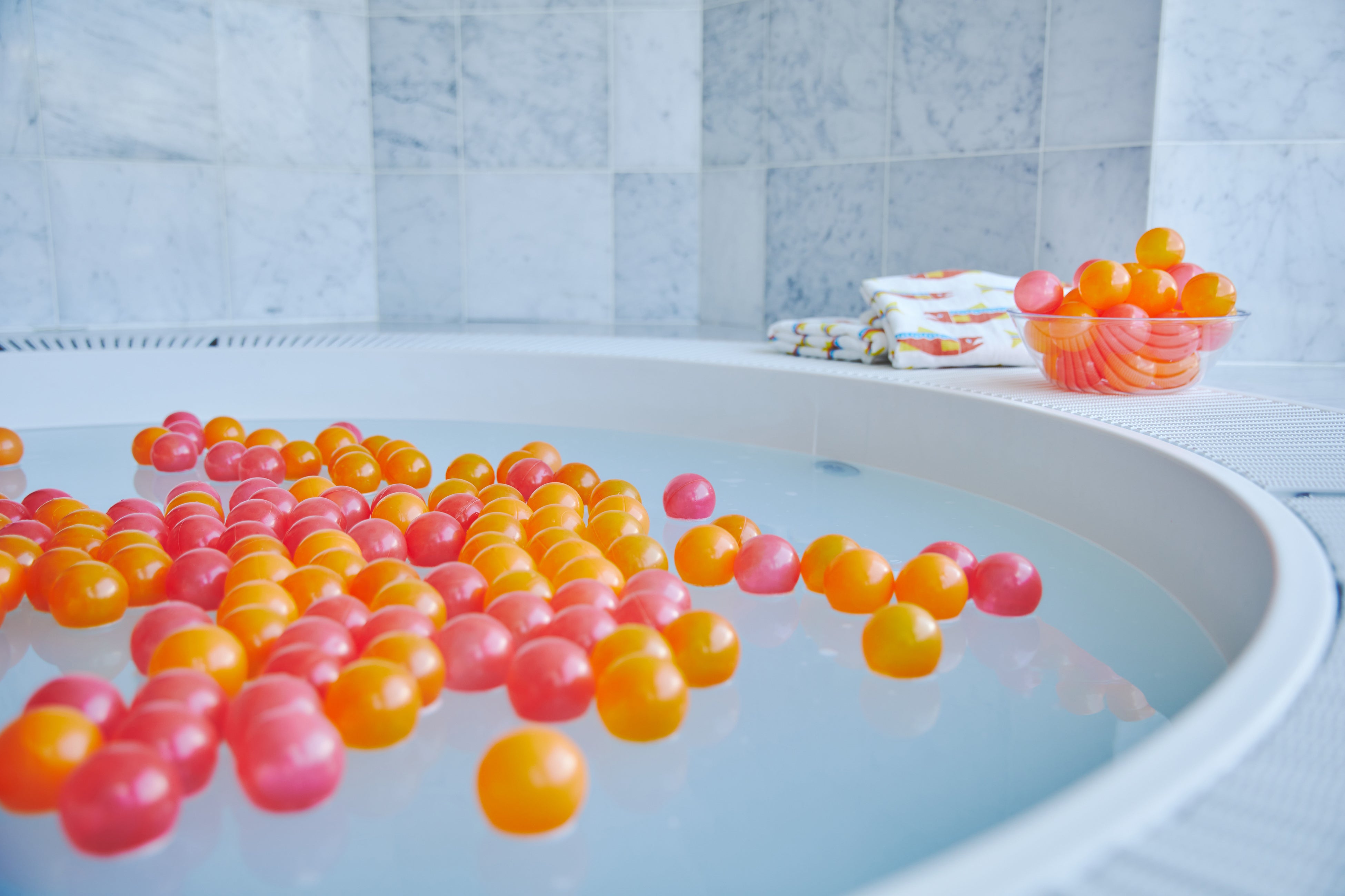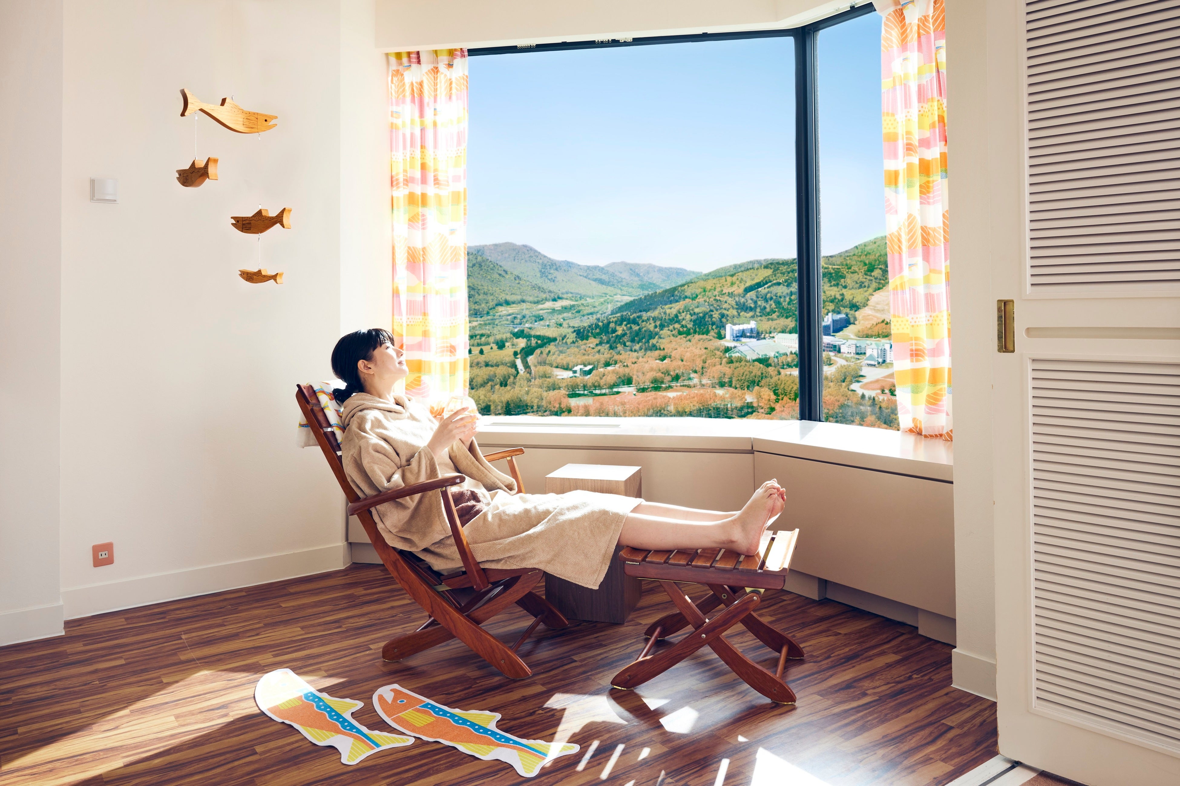 鮭ルームに備える展望ジェットバスは、温度調節が可能なバイブラ風呂なので、水風呂にすることが可能です。また、客室には、白く染まる入浴用化粧品でご飯に見立て、いくらをイメージしたボールを加え「いくら丼水風呂」を楽しめるセットを用意しています。ととのうために必要な水風呂までもが、鮭尽くし!深さ80cmのジェットバスでは、8度の水風呂から、好みの温度で肩までしっかりと浸かることができます。また、鮭ルームが位置するのは、地上約110メートル、最上階の客室です。バスルームには、リクライニングチェアを設置。窓の外には、北海道の広い空と、山々の景色に囲まれた絶景の内気浴でととのうことが可能です。