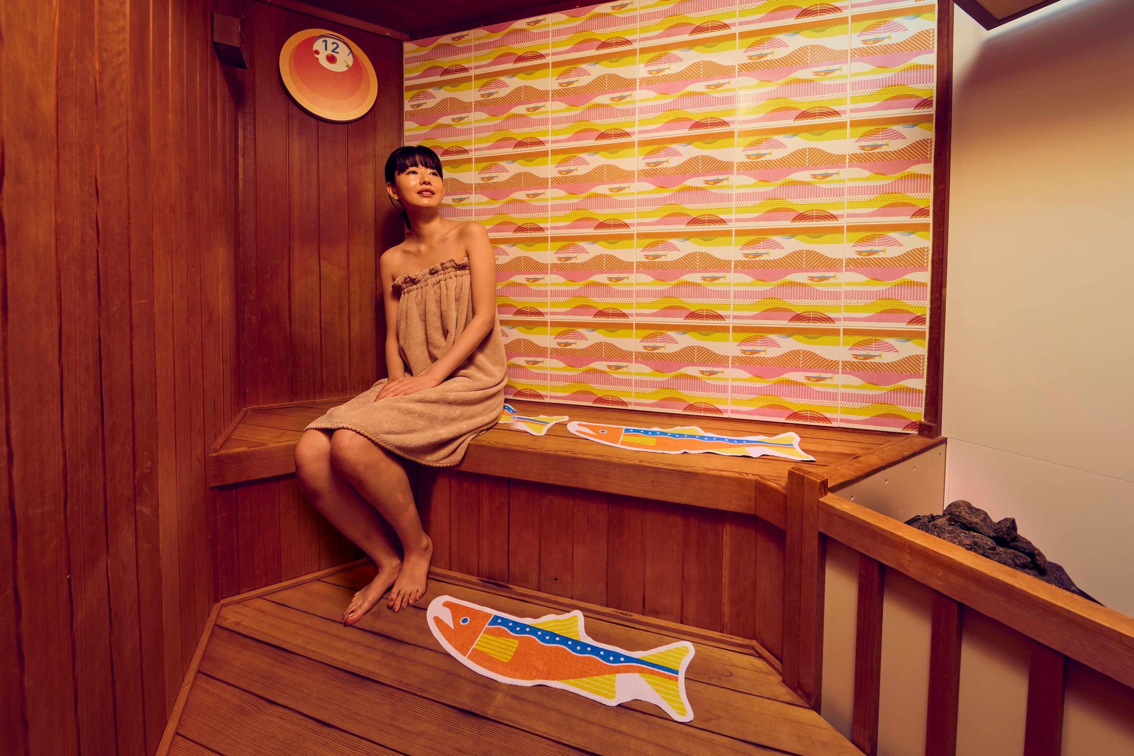 鮭サウナは、壁面や扉の取っ手、サウナマットに鮭のデザインを施すなど、鮭にこだわり尽くしたサウナです。いくら型のランプシェードや、いくらから稚魚、成魚になる過程を表現した12分計を設置。12分計をじっと眺めていると、熱いことを忘れてしまうほどの可愛らしいデザインです。サウナストーブは、好みの温度に設定でき、セルフロウリュ(*)も可能です。サウナ初心者から上級者まで、自分好みのスタイルで滞在中は24時間いつでもととのうことができます。