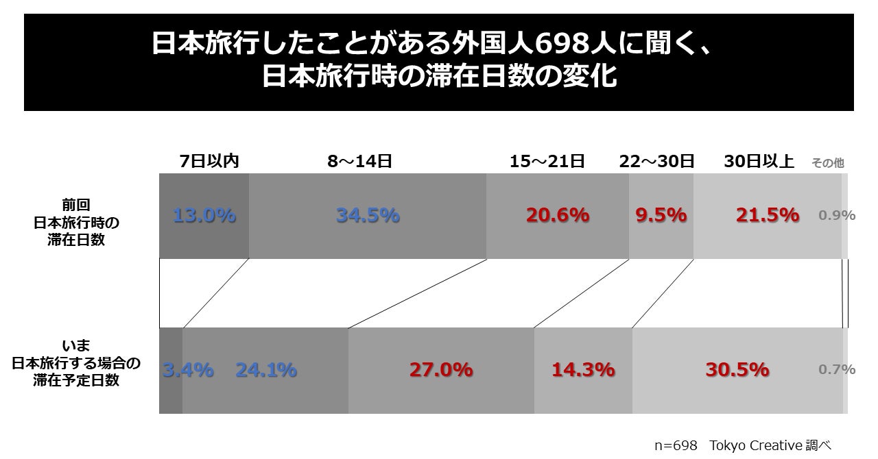 過去に日本旅行したことがある日本以外の国籍をもつ外国人698人を対象に、日本旅行の滞在日数の変化を調査しました。その結果、いま日本旅行をする場合の滞在予定日数として、15日以上の滞在を検討している人が全体の7割超となりました。前回の日本旅行滞在期間が15日以上だった人と比較すると、15日以上の滞在を検討する人は2割以上増加する結果となりました。