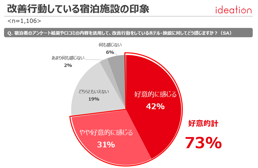 改善行動をしている宿泊施設に対して「好意的に感じる」「やや好意的に感じる」と答えた合計の割合は73%であり、改善活動を行うこと自体が印象UPにつながる。
