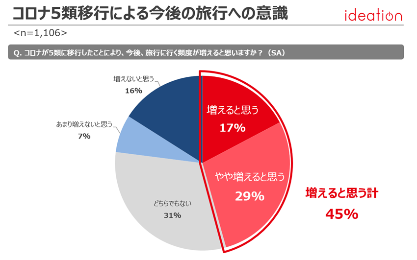 コロナが5類に移行したことにより、今後の旅行頻度が「増えると思う」「やや増えると思う」と回答した人は45%であり、「増えない」「あまり増えないと思う」と回答した人の約2倍。脱コロナ後の旅行への意識の高まりが見られる。