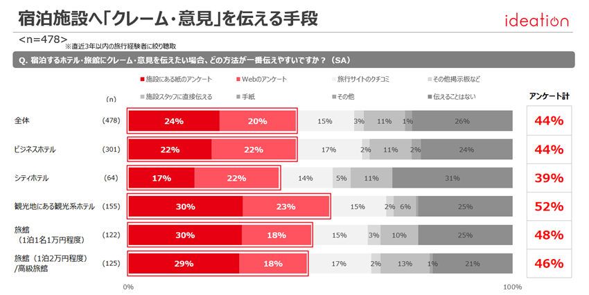 また、「アンケート」の中でも「Webのアンケート」ではなく「紙のアンケート」のほうが求められており、特に「クレーム・意見」は観光系ホテル・旅館で約3割が最も伝えやすいと回答した。