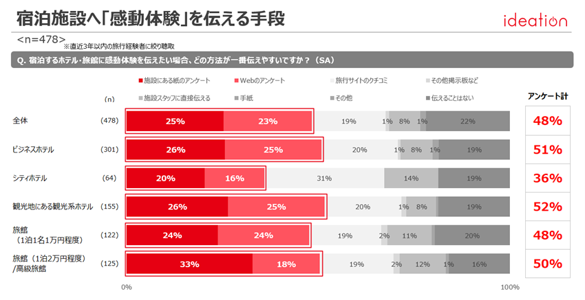 「感動体験」、「クレーム・意見」どちらにおいても「アンケート」が最もホテル・旅館側に伝えやすいと答えた割合が半数近くとなっている。