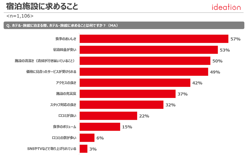 ホテル・旅館に求めることのTOP3は「食事のおいしさ(57%)」「宿泊料金が安い(53%)」「施設の清潔さ(50%)」であった。