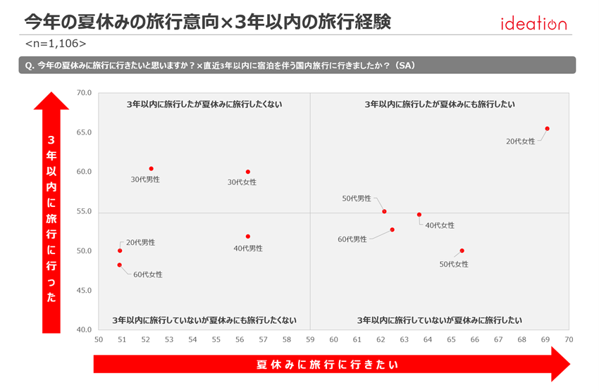 性年代別で今年の夏休みの旅行意向と3年以内の旅行経験を掛け合わせてみると、20代男女で大きな差が見られた。20代男性は3年間で旅行していない上に夏休みも旅行するつもりがなく、20代女性は3年間で旅行しているが夏休みも旅行したいと答えた。この3年間は旅行を控えていたが、今後旅行が増えそうな年代は50~60代男性と40~50代女性。