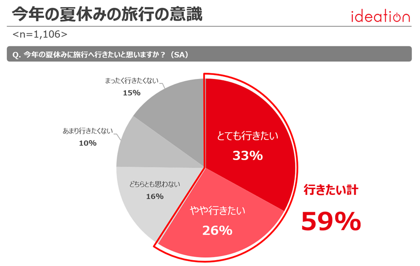 今年の夏休みに旅行へ行きたいと思っている人は59%で過半数を占める結果となった。