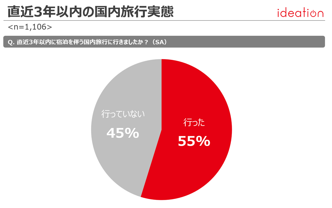 コロナ禍においても、GoToトラベルの実施やコロナが落ち着く時期があったが、国内旅行に行ってない人は45%と半数近くになることが分かった。
