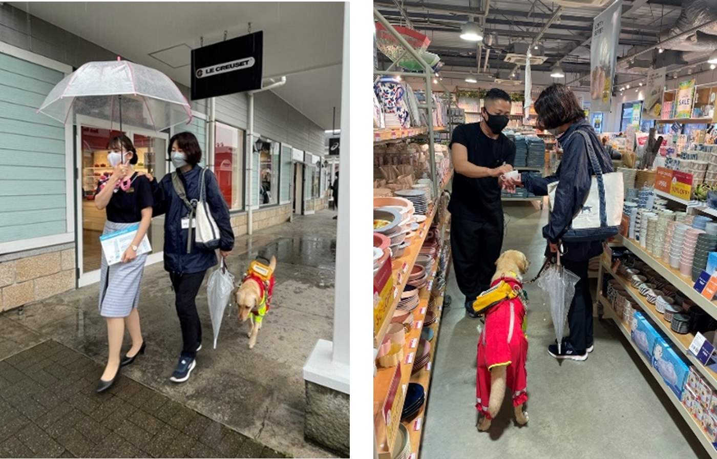 「身体障害者補助犬法」では、盲導犬などの補助犬が公共施設や交通機関、不特定多数の人が利用する商業施設や飲食店で補助犬を受け入れることが義務付けられていますが、成立から20年が経過するも、未だ同伴を拒否されるケースが散見されています。佐野プレミアム・アウトレットでは、盲導犬ユーザーのお客様のご来店をきっかけに、補助犬の役割や受け入れ方法を学ぼうと、東日本盲導犬協会へ相談を持ち掛け、2022年5月に初めて本研修をスタートしました。