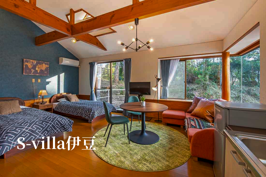 S-villa伊豆は、露天風呂付の温泉があり、無料Wi-Fi完備、BBQができる施設となっております。土地柄、海鮮が豊富なため、スーパーで食材を購入し、施設内で宿泊と合わせてゆっくりと楽しんでいただくことができます。