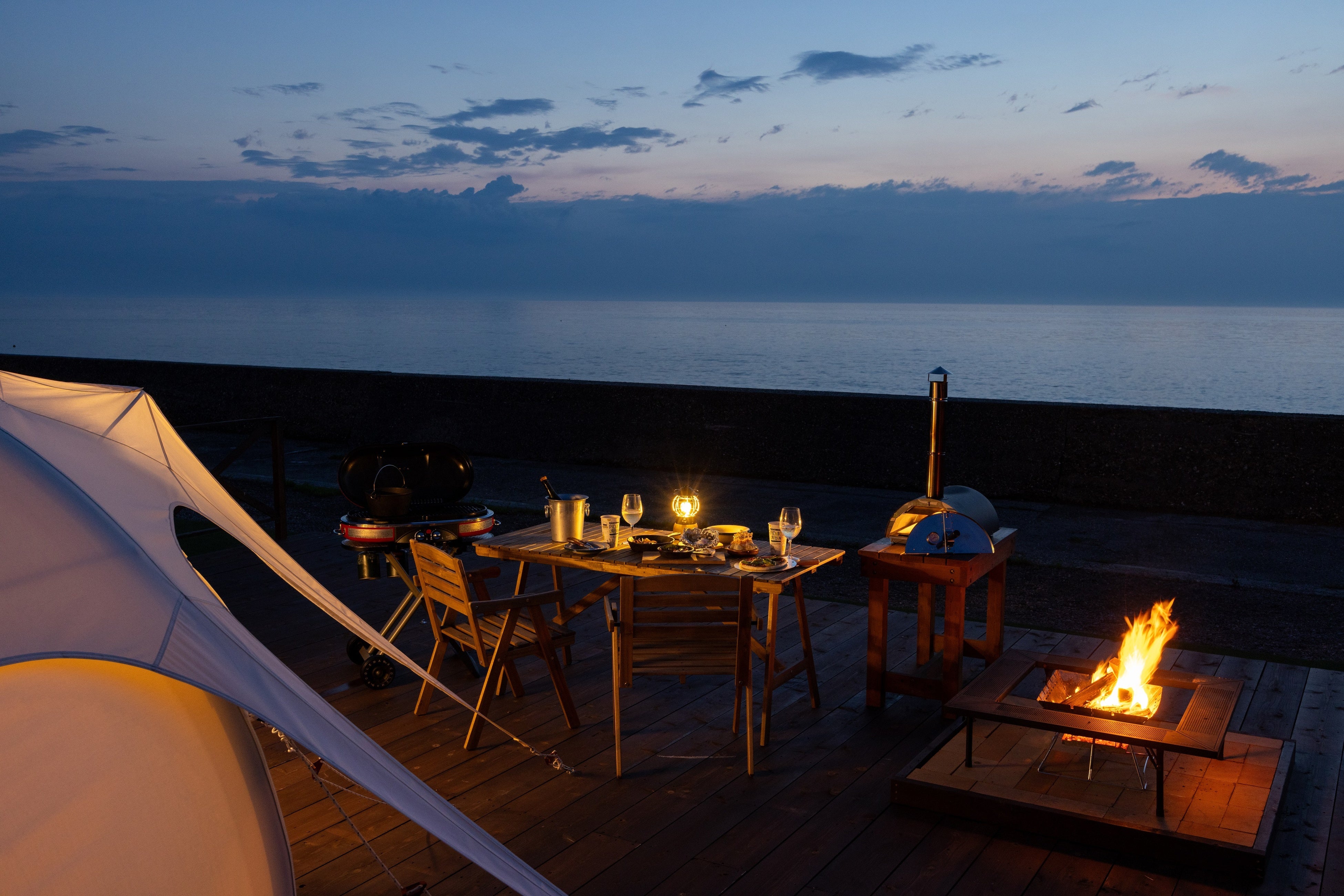 テントの外にはオーシャンビューを満喫できるテラスを設置。自然に囲まれながら、プライベートテラスでサンセットやマジックアワー、夜空にうかぶ星空と地元食材の料理が楽しめます。